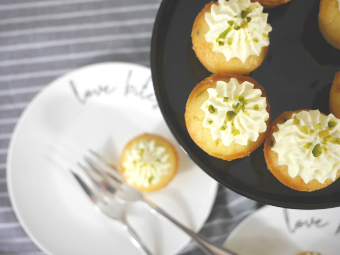 Das Ei, die Milch und die flüssige Butter verrühren. Den Orangensaft und den Abrieb hinzufügen. Zucker, Mehl und Backpulver vermischen und zusammen mit den gehackten Pistazien und dem Lemoncurd unter die Zutaten rühren.