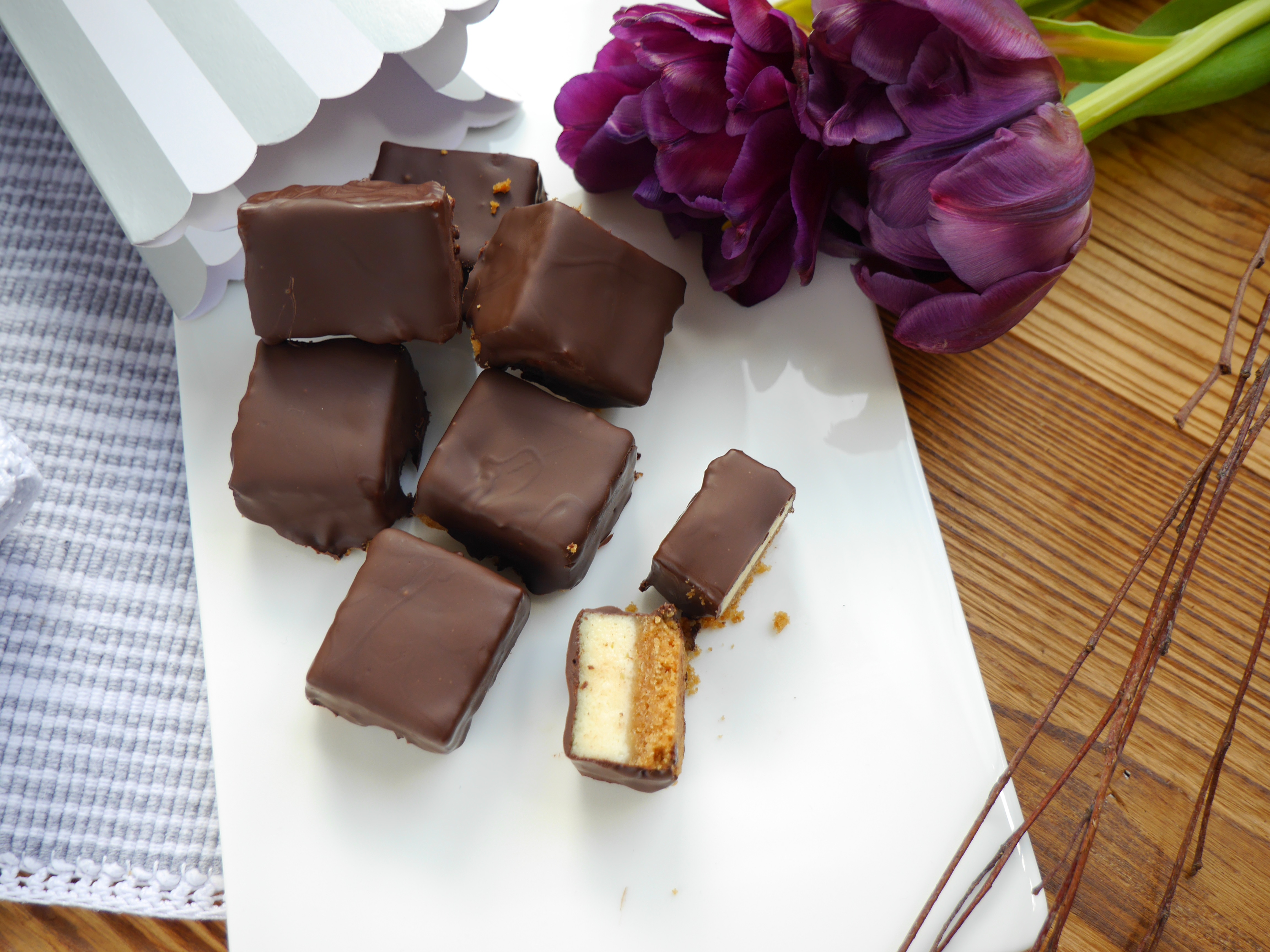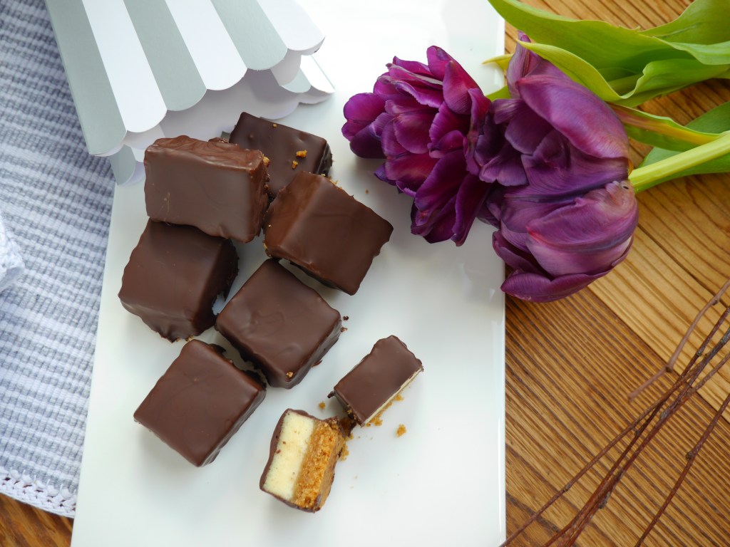 3. Für die Deko die Kuvertüre langsam schmelzen und mit dem Palmin mischen. Den Kuchen in Würfel 3 cm x 4 cm schneiden und jeden einzelnen mit der Oberseite in die Kuvertüre tunken. Kurz trocknen lassen.