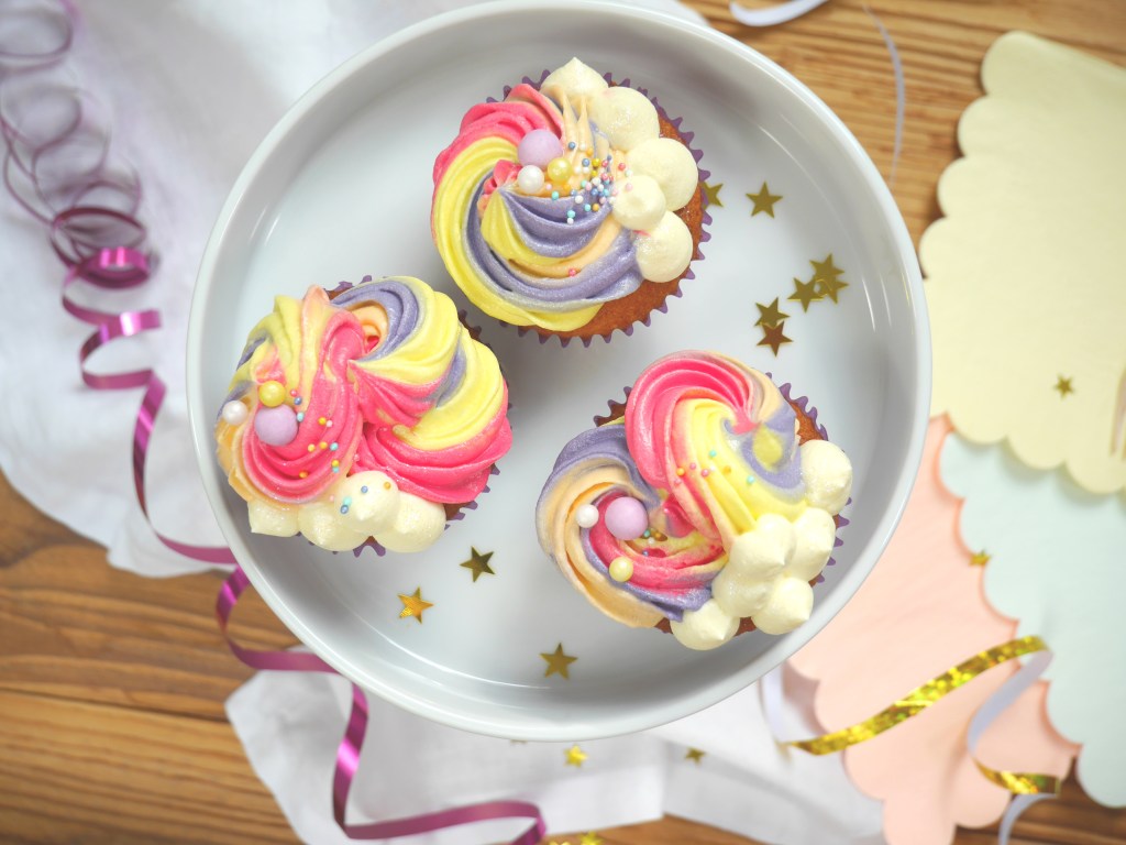 Die fertige Creme gleichmäßig auf 5 Schüssel aufteilen und jeweils mit einer Lebensmittelfarbe (eine Creme bleibt weiß) einfärben. Die 4 bunten Crems in Streifen einen Spritzbeutel mit Sterntülle füllen, dass beim Aufspritzen ein Regenbogen entsteht. Die Cupcakes jeweils damit dekorieren. Die weiße Creme in einen Spritzbeutel mit Lochtülle füllen und abschließen kleine Wölkchen aufspritzen.