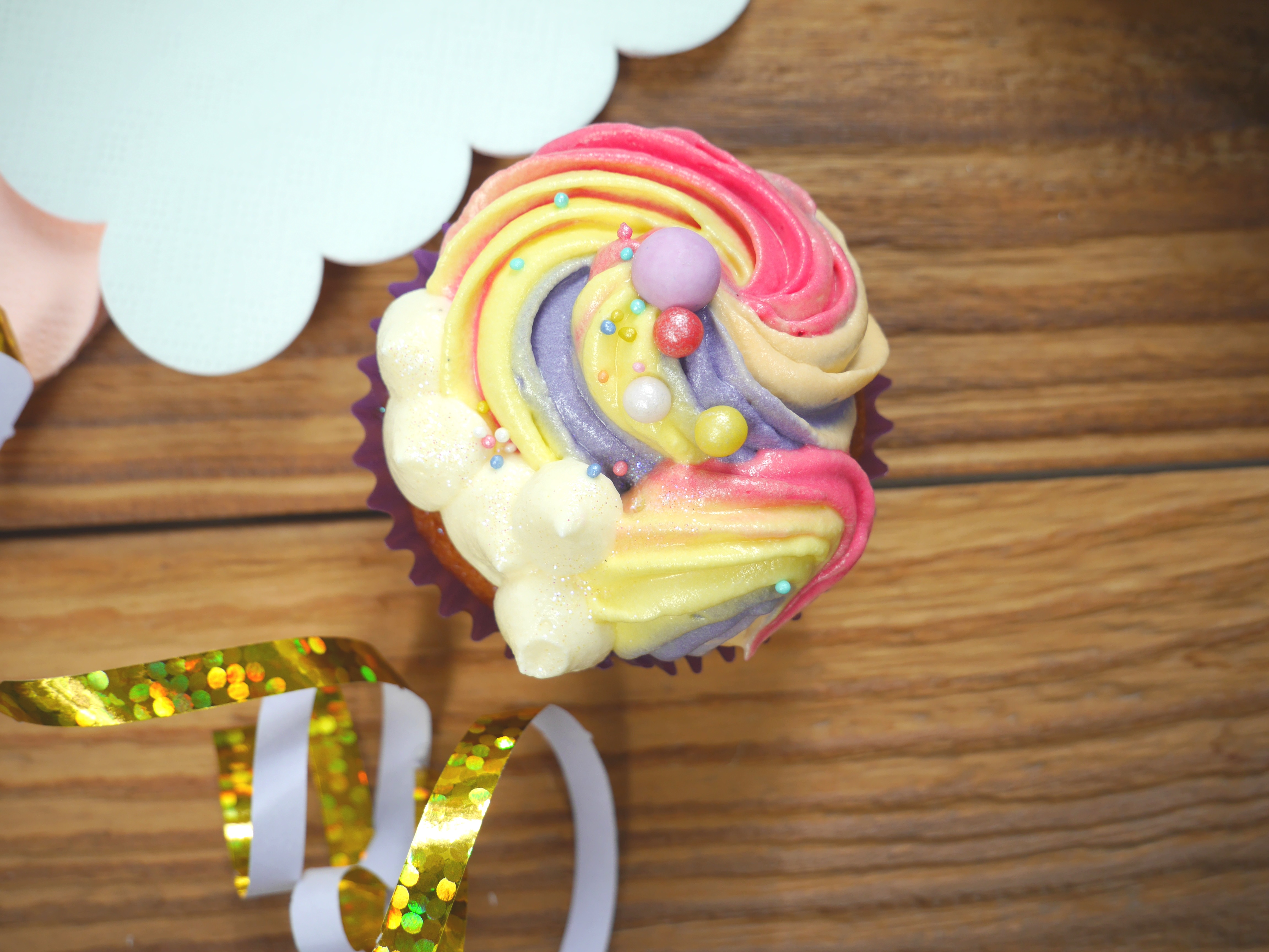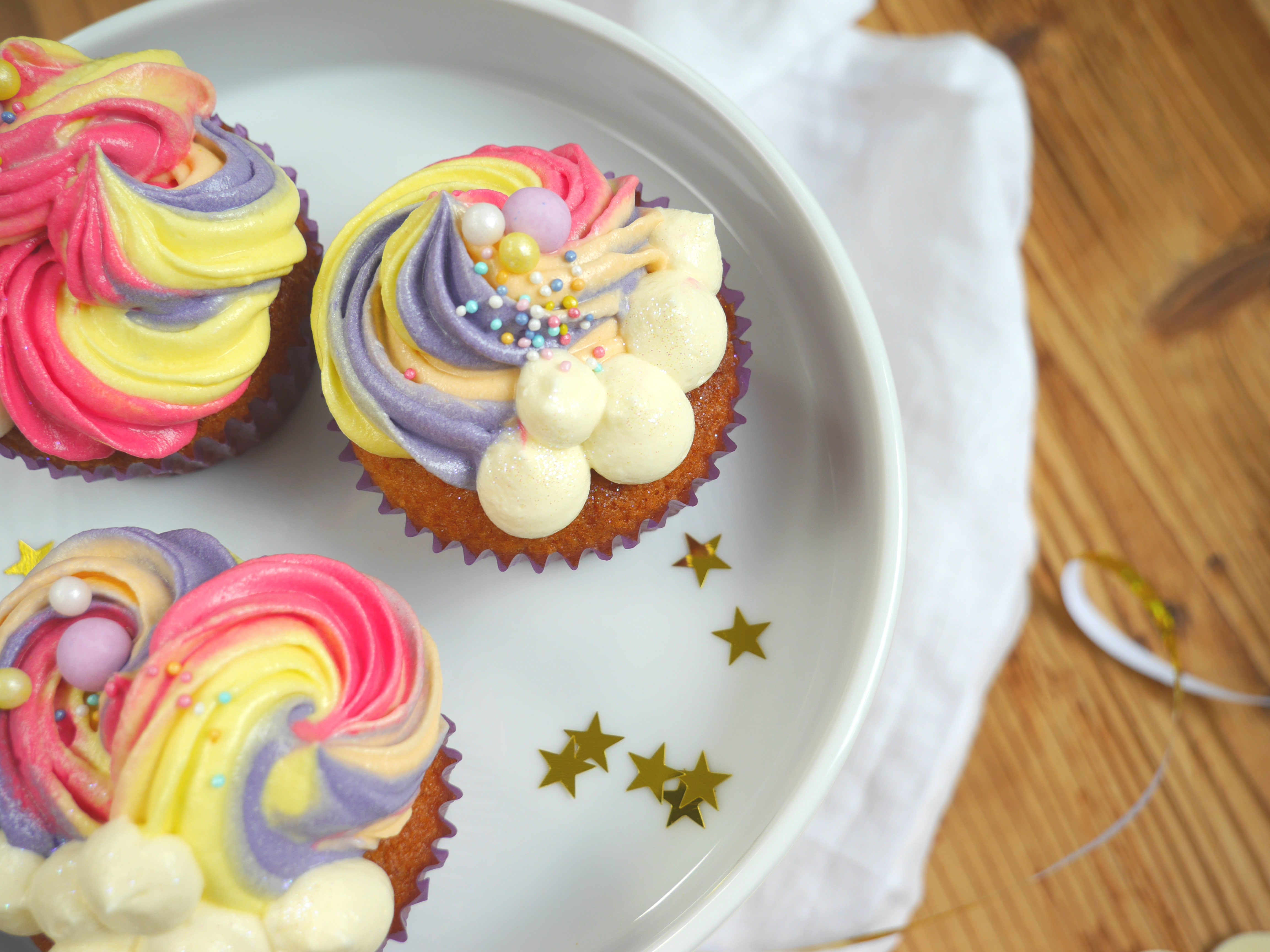 2. Für die Deko jeden Cupcakes mit den bunten Zuckerperlen und dem essbaren Glitter verzieren.