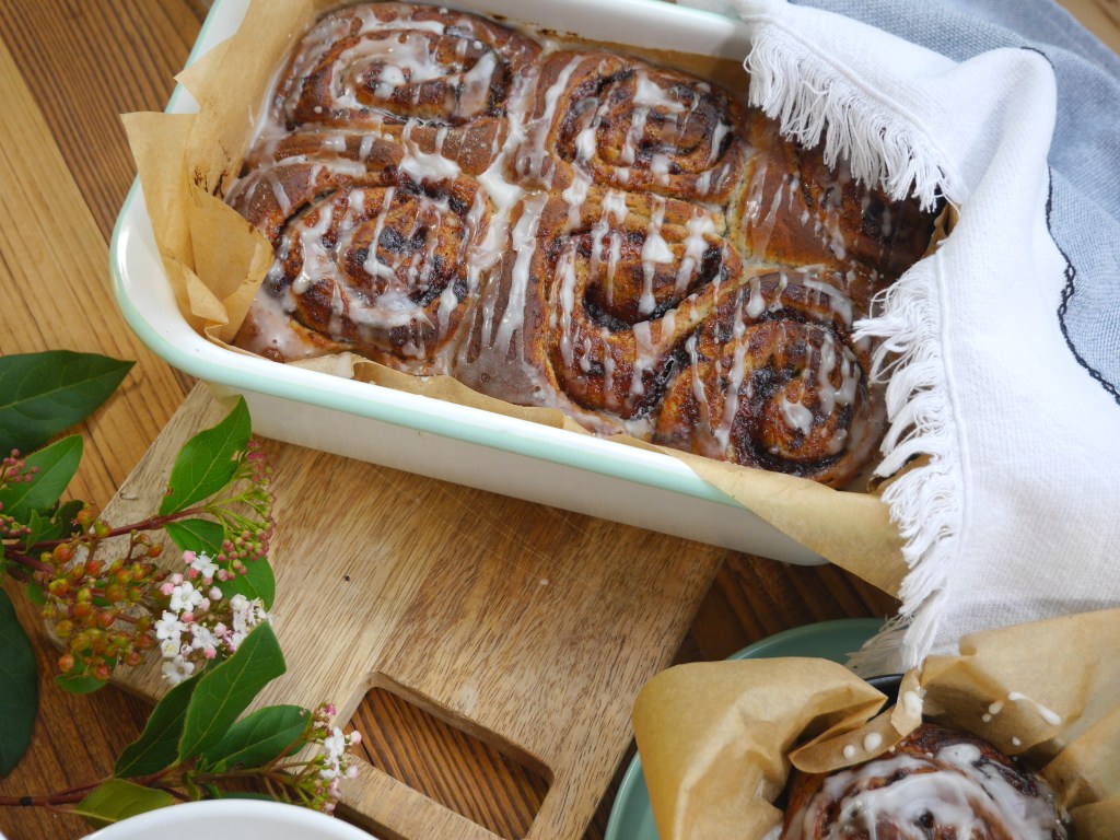 Den Teig in 8 Streifen schneiden (von der langen Seite her) und 8 Schnecken aufrollen. Die fertigen Schnecken in einem mit Backpapier ausgelegte Auflauf-/ oder Backform stellen und zugedeckt weitere 15 Minuten gehen lassen.
