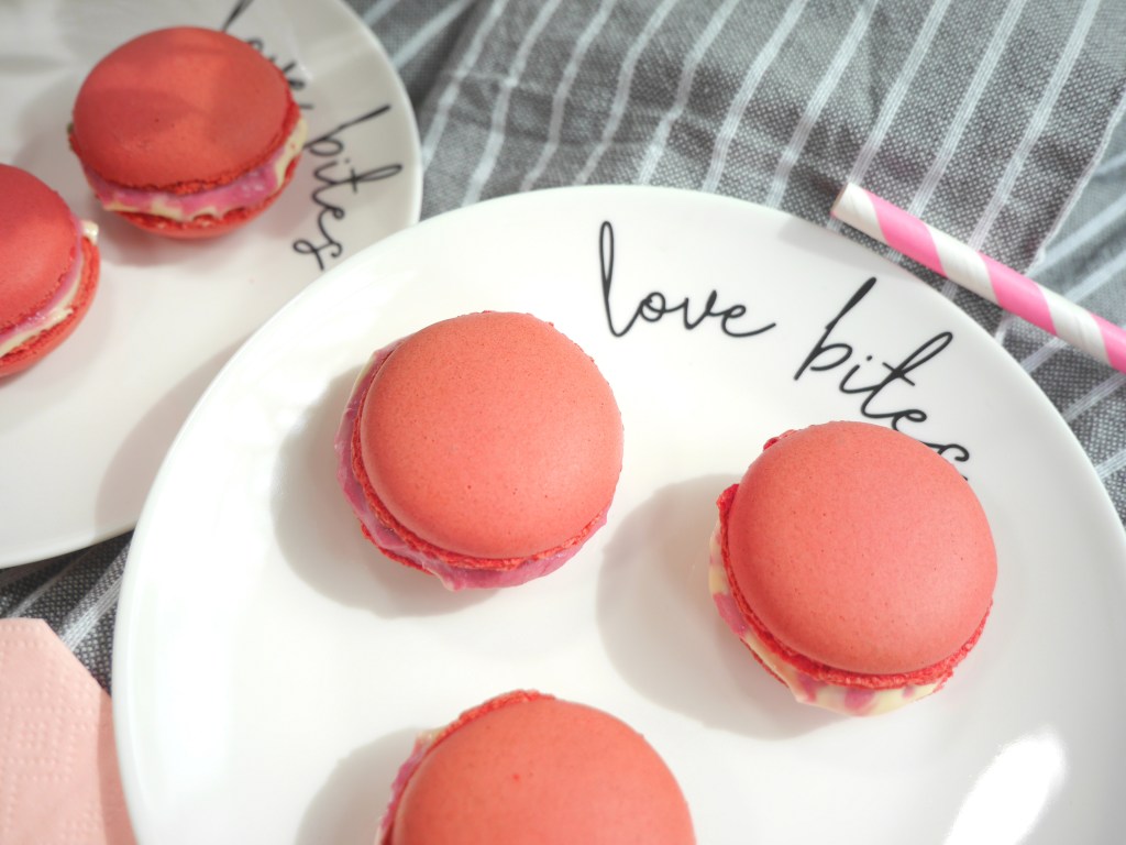 Die beiden Füllungen in einen Spritzbeutel füllen. Auf jeweils eine Macaronhälfte erst die Zitronen- dann die Himbeerfüllung ca. 2 mm dünn spritzen und die zweite Hälfte daraufsetzen. Mit einem Zahlstocher kleine Kreise ziehen, sodass ein Muster entsteht.