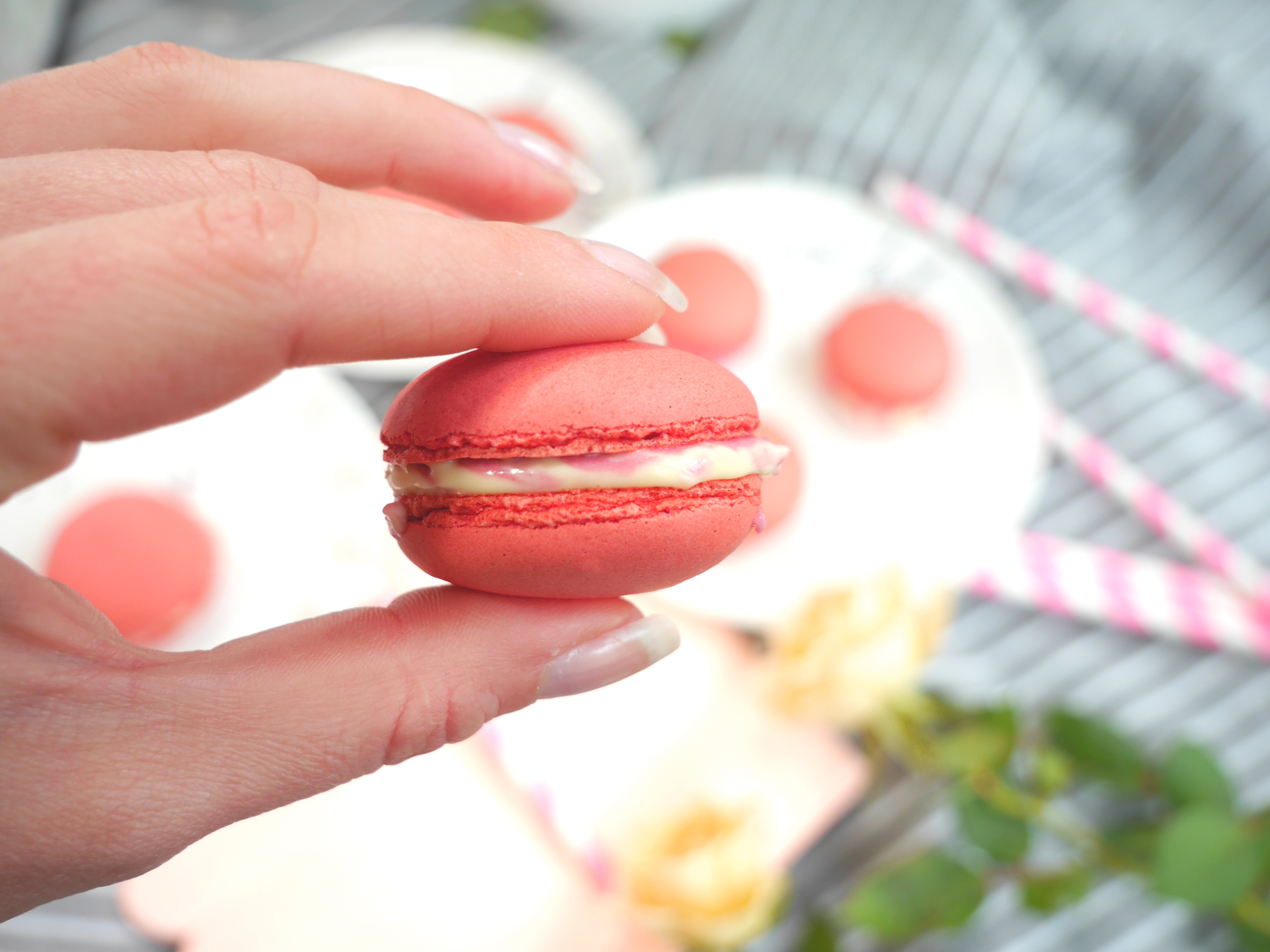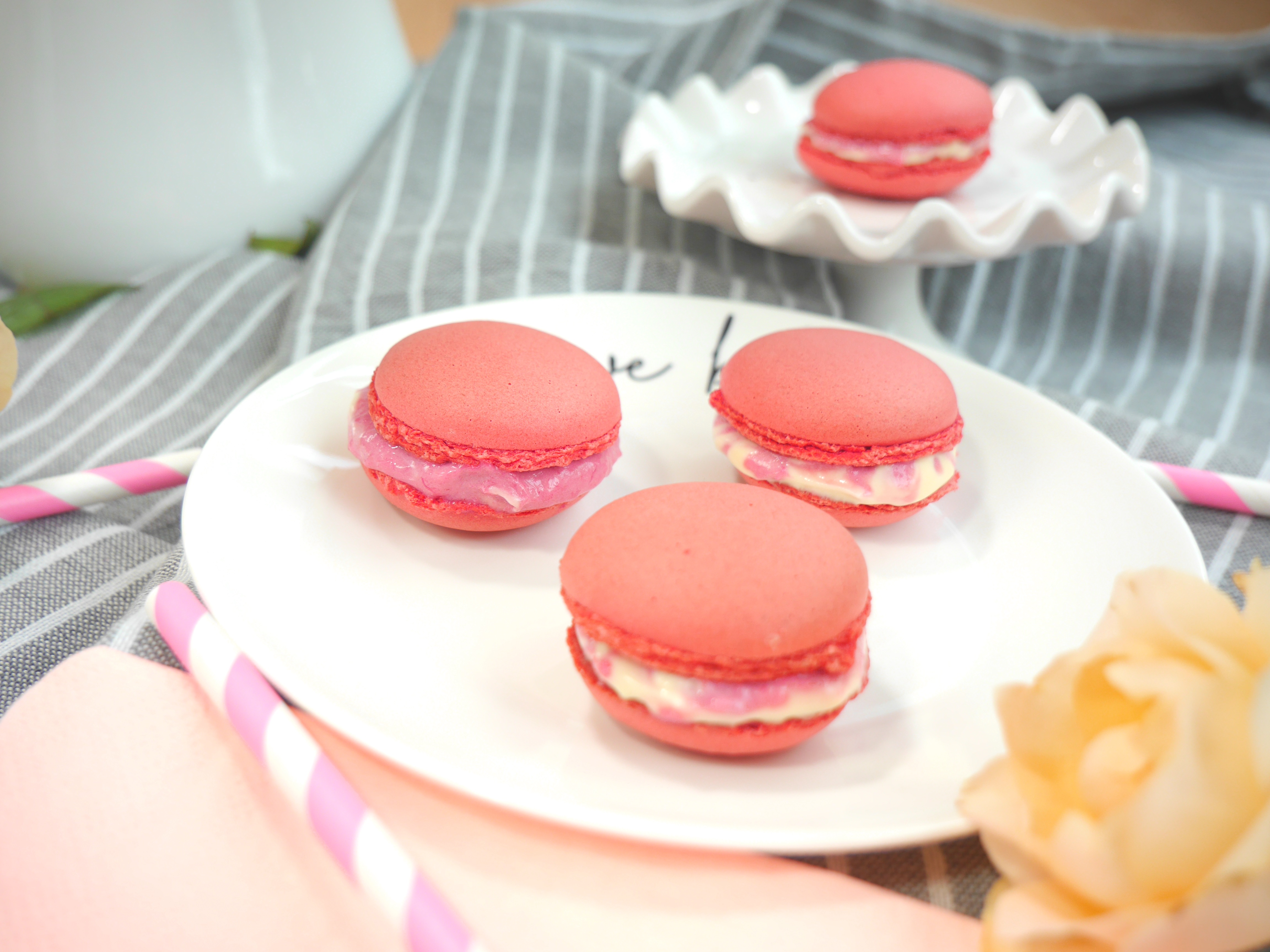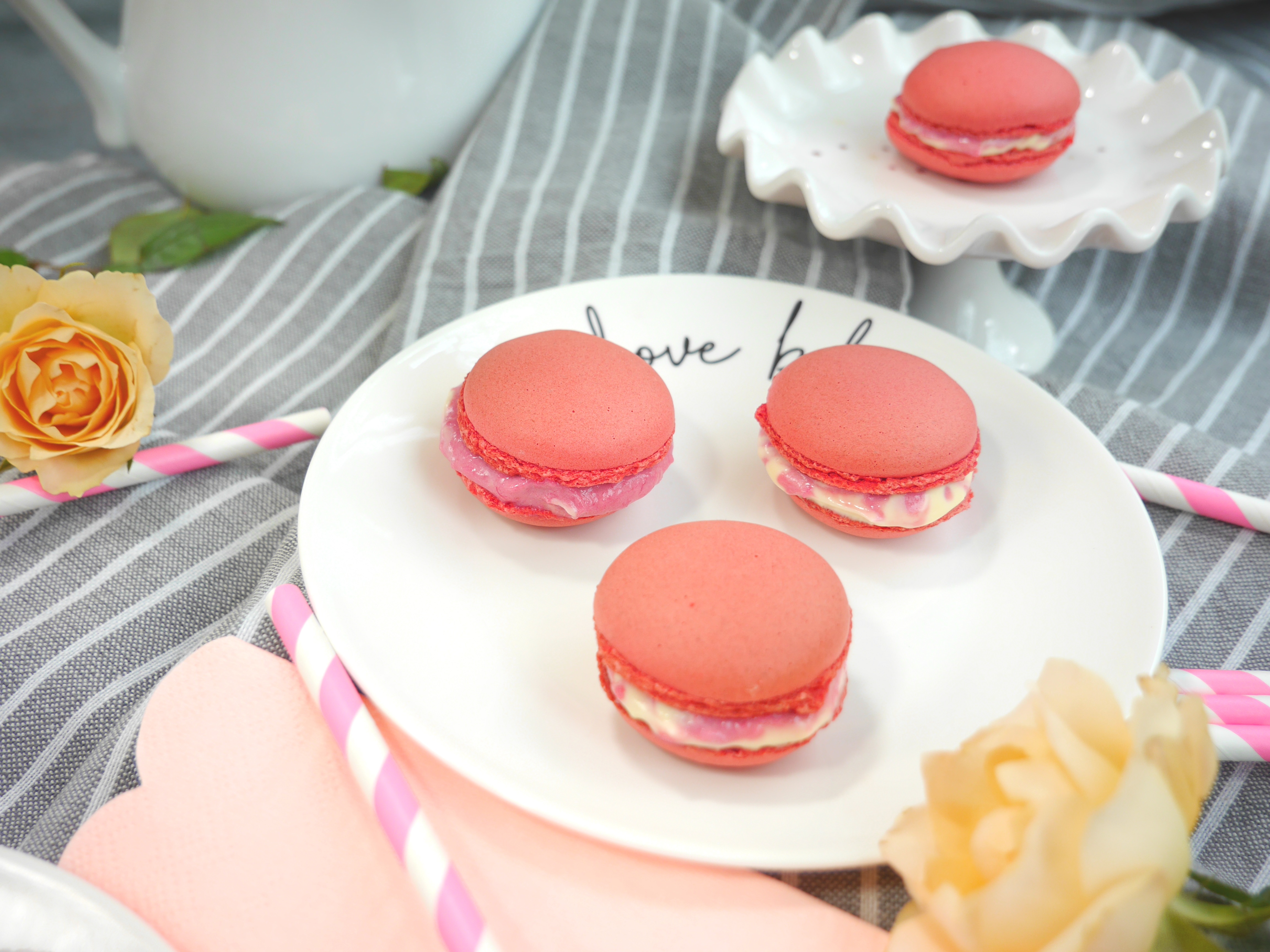 Die beiden Füllungen in einen Spritzbeutel füllen. Auf jeweils eine Macaronhälfte erst die Zitronen- dann die Himbeerfüllung ca. 2 mm dünn spritzen und die zweite Hälfte daraufsetzen. Mit einem Zahlstocher kleine Kreise ziehen, sodass ein Muster entsteht.