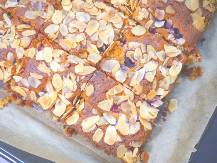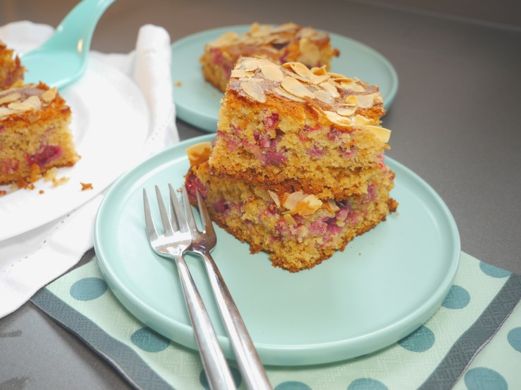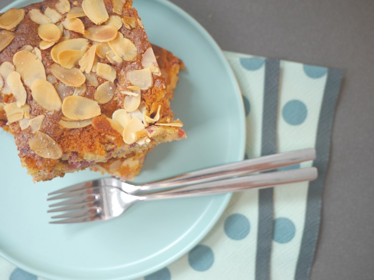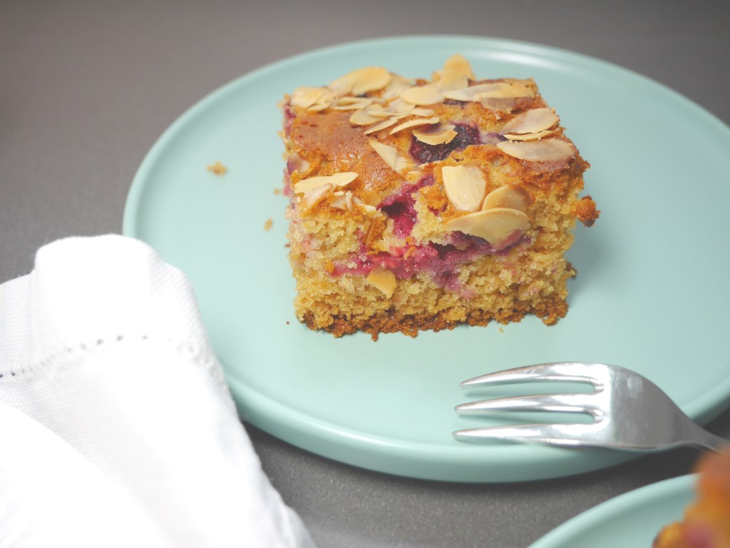 2. Für den Belag die gehobelten Mandeln mit dem Zucker mischen und gleichmäßig auf den Kuchen streuen.