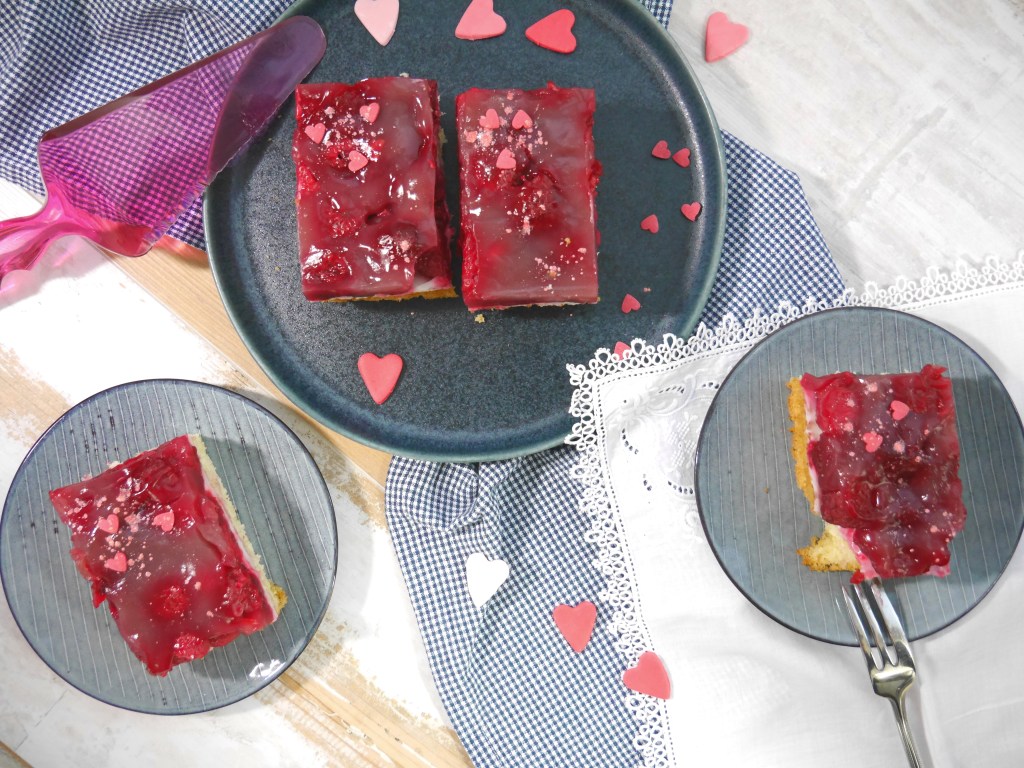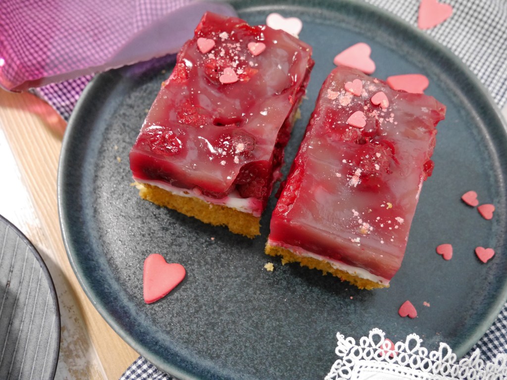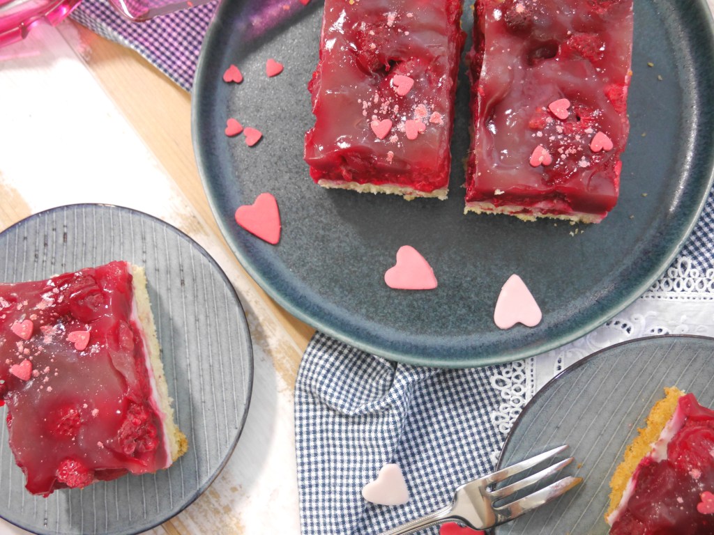 3. Für die Deko die Himbeeren gefroren auf der Creme verteilen. Den Saft, Zucker und Stärke verrühren und langsam unter Rühren aufkochen. Über die Himbeeren geben, sodass alle bedeckt sind. Im Kühlschrank die Masse ca. 2 Stunden kühlen bis die Masse fest ist.