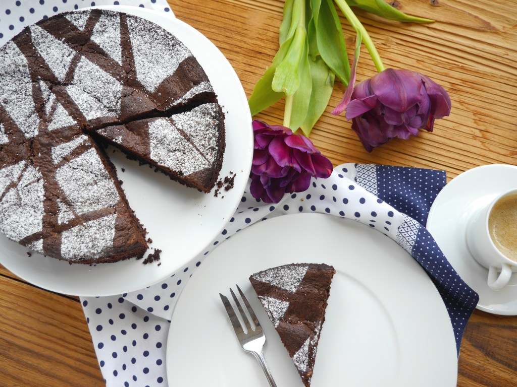 Den fertigen Teig in eine gefettete und mit Backpapier ausgelegte Springform (26 cm Durchmesser) füllen und bei 180 Grad Umluft 50 Minuten backen.