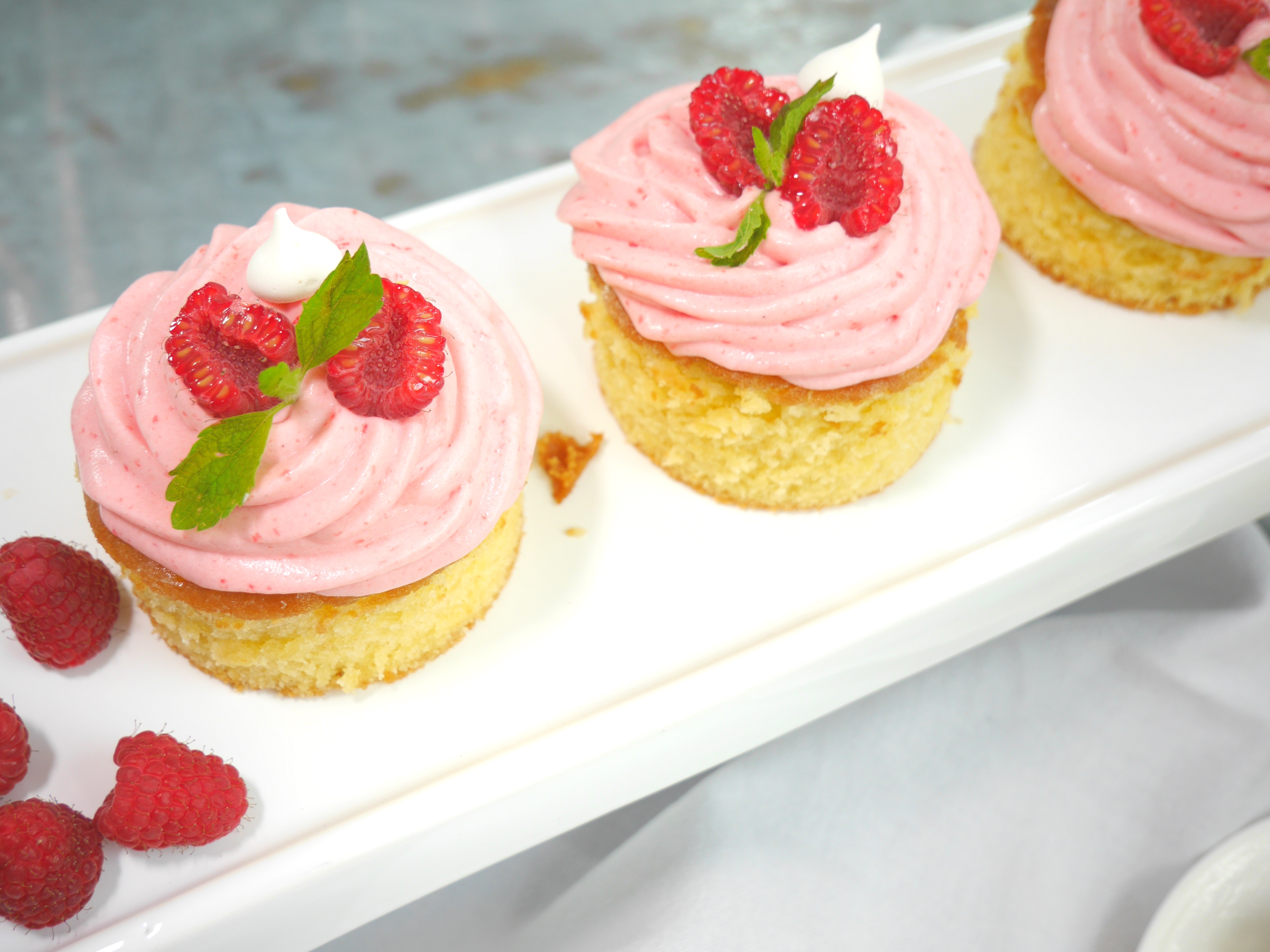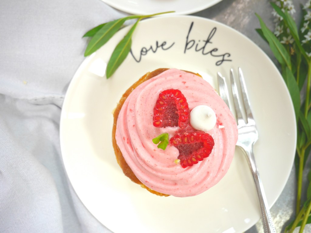 2. Für die Deko die Törtchen mit den Himbeeren und ggf. Minze und etwas essbaren Glitter verzieren.