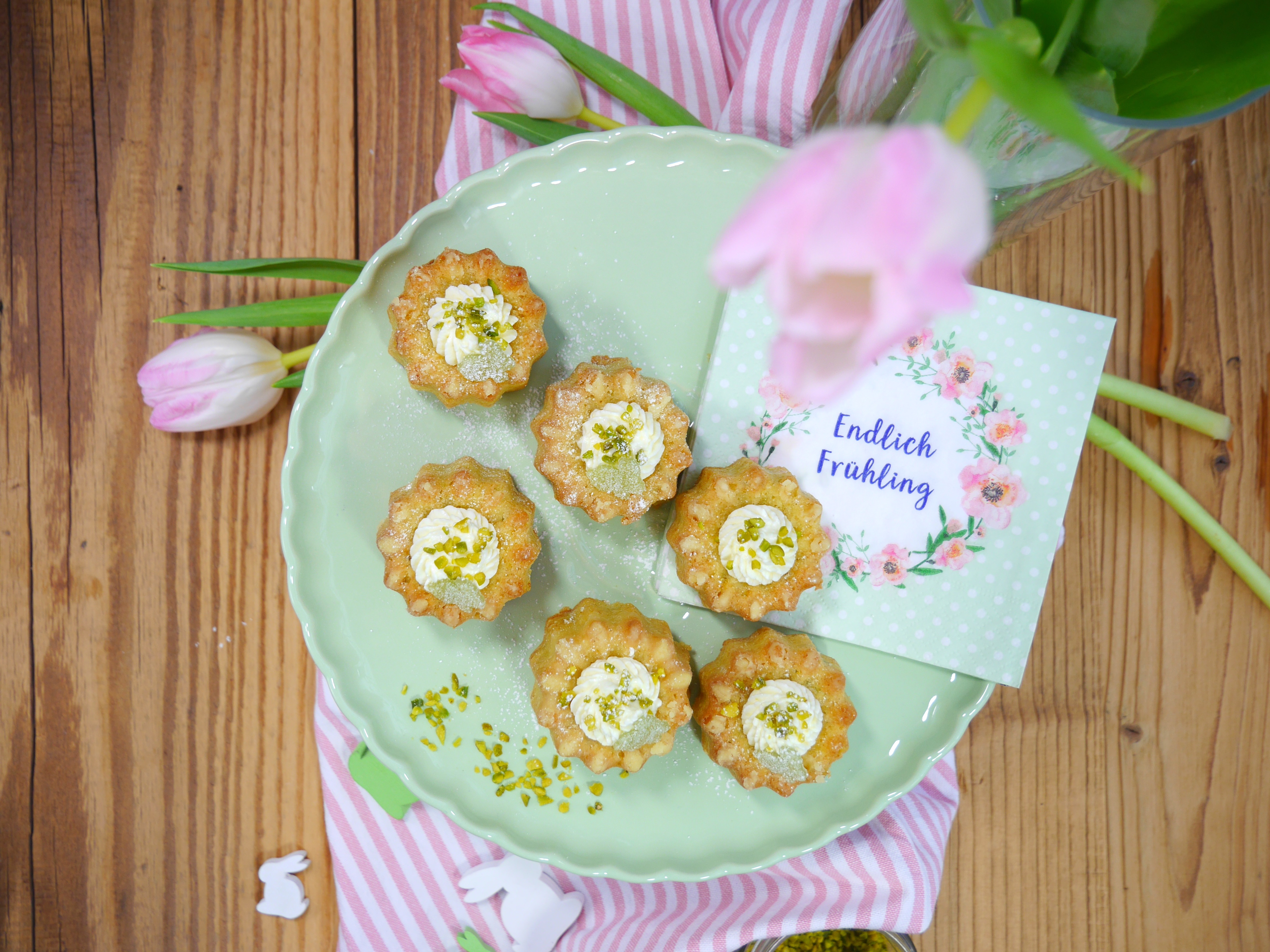3. Für die Deko die fertigen Canelés mit den Pistazien und den Hasen dekorieren.