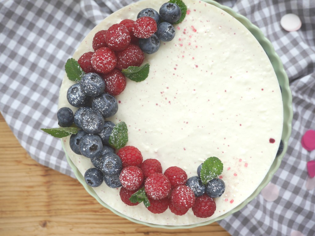 Einen Biskuitboden auf eine Tortenplatte legen und mit einem Tortenring fest umschließen. Die Hälfte der leicht gelierten Käsesahne darauf verteilen, die Beerenfüllung in die Mitte geben und mit der weiteren zwei Drittel der Käsesahne bedecken. Abschließend den zweiten Biskuitboden darauflegen, andrücken und das letzte Drittel Käsesahne auf der Oberseite der Torte verteilen.