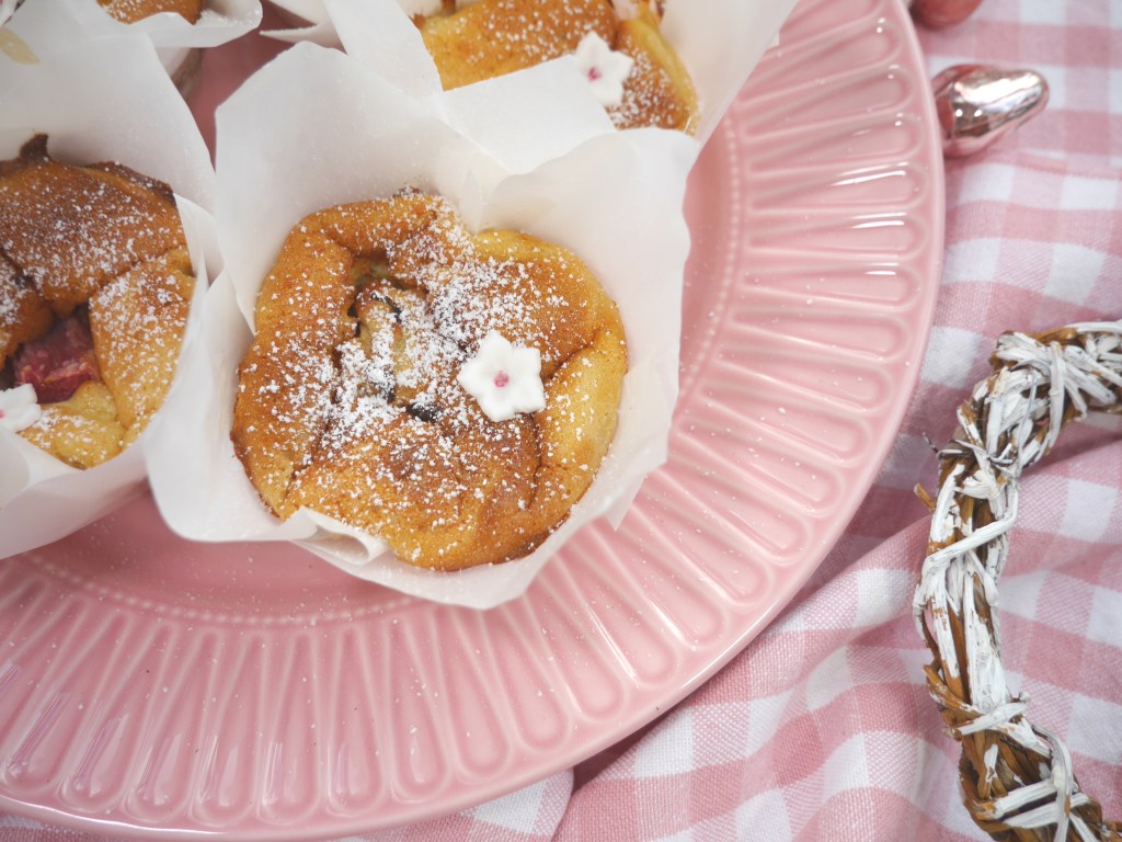 Die Eier trennen. Das Eigelb mit 3 EL Wasser, dem braunen Zucker und dem Vanillezucker schlagen. Die übrigen Zutaten, bis auf das Eiweiß, unterrühren. Das Eiweiß steif schlagen und vorsichtig unter den Teig heben. Den kleingeschnittenen Rhabarber zu dem fertigen Teig geben und kurz mischen.