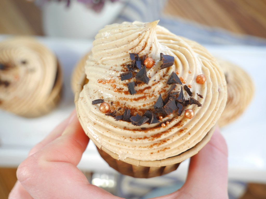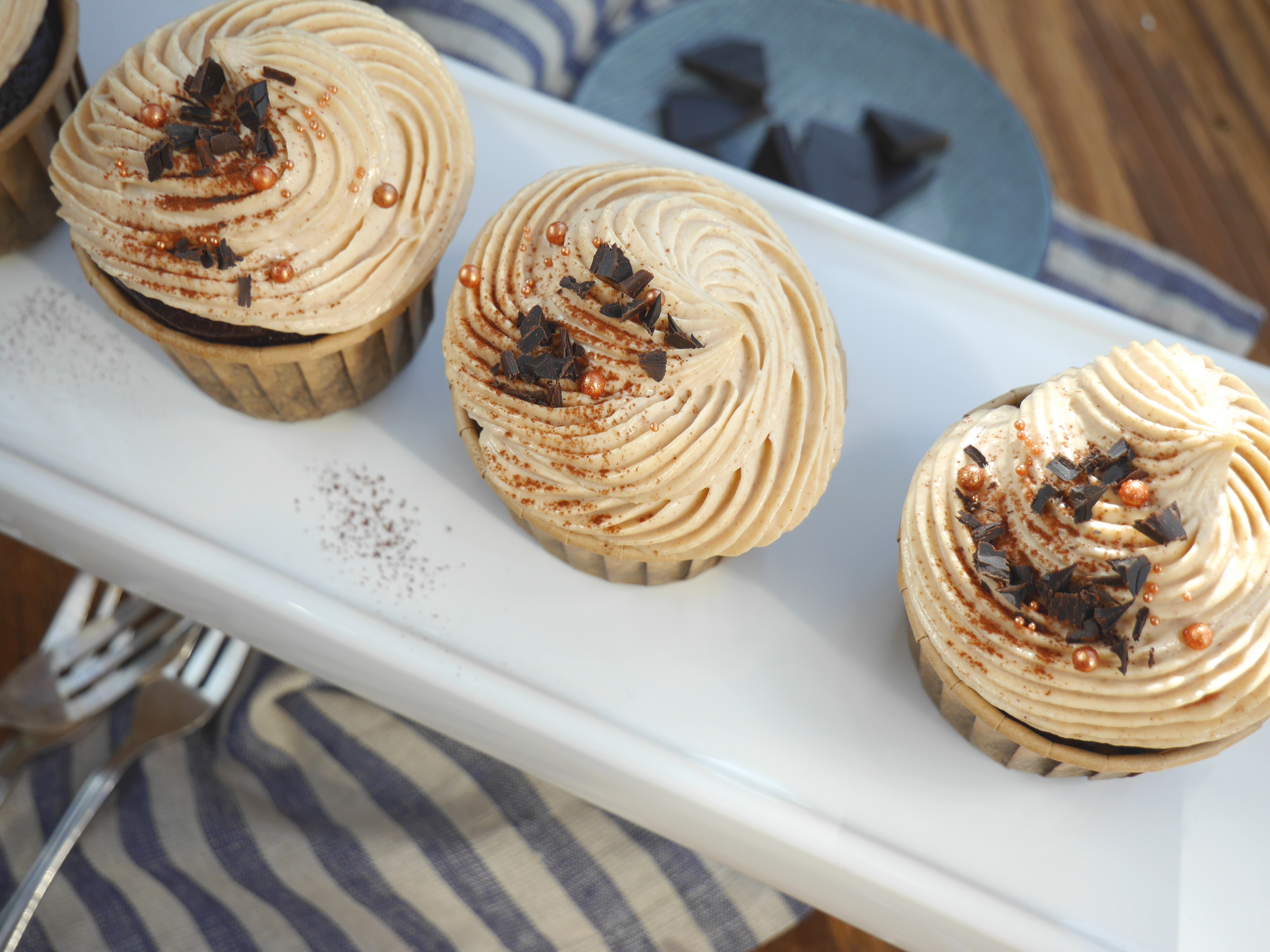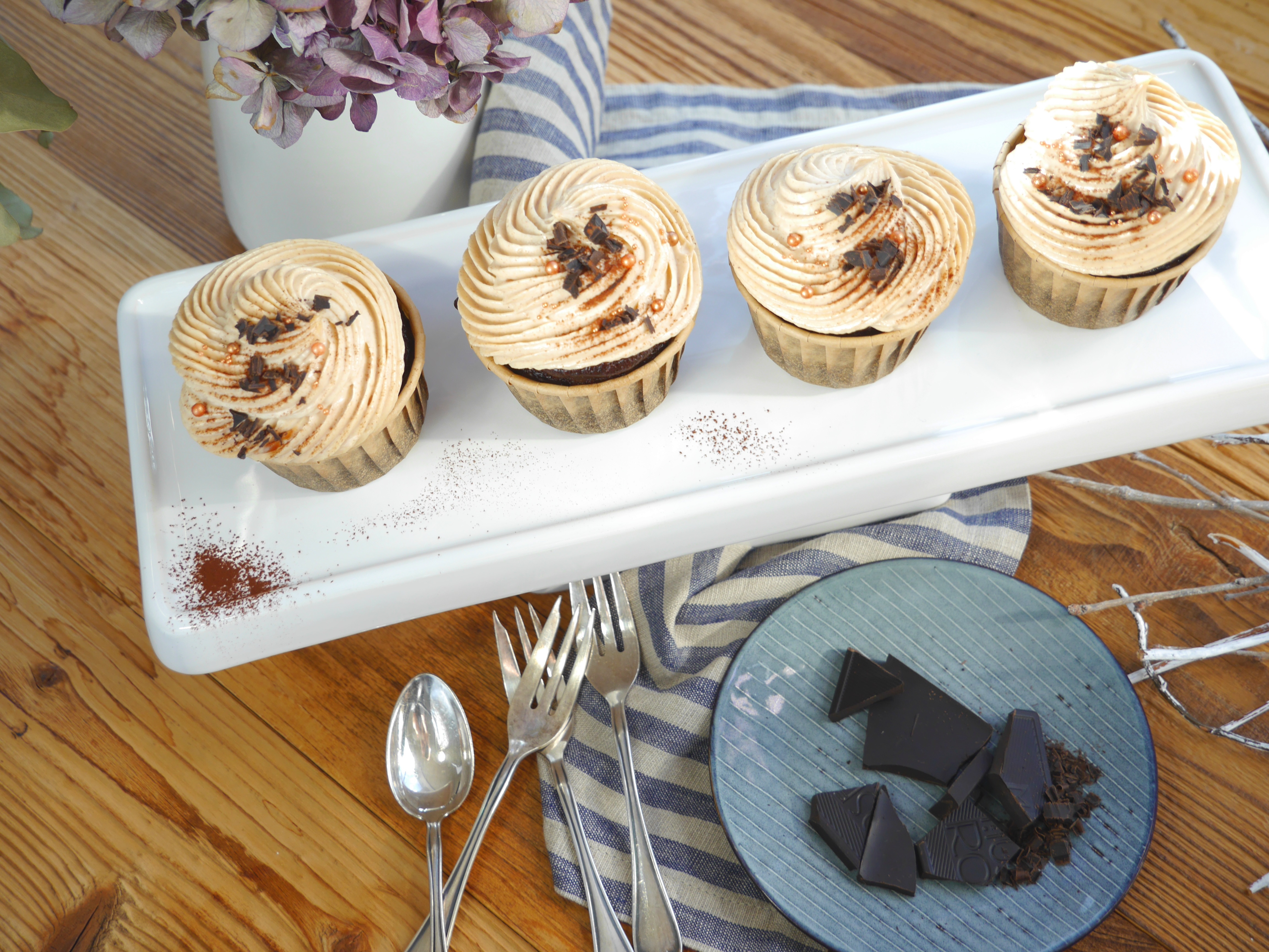 3. Für die Deko jeden Cupcakes mit etwas Backkakaopulver, Schokoladenraspeln und ggf. ein paar Zuckerperlen dekorieren.