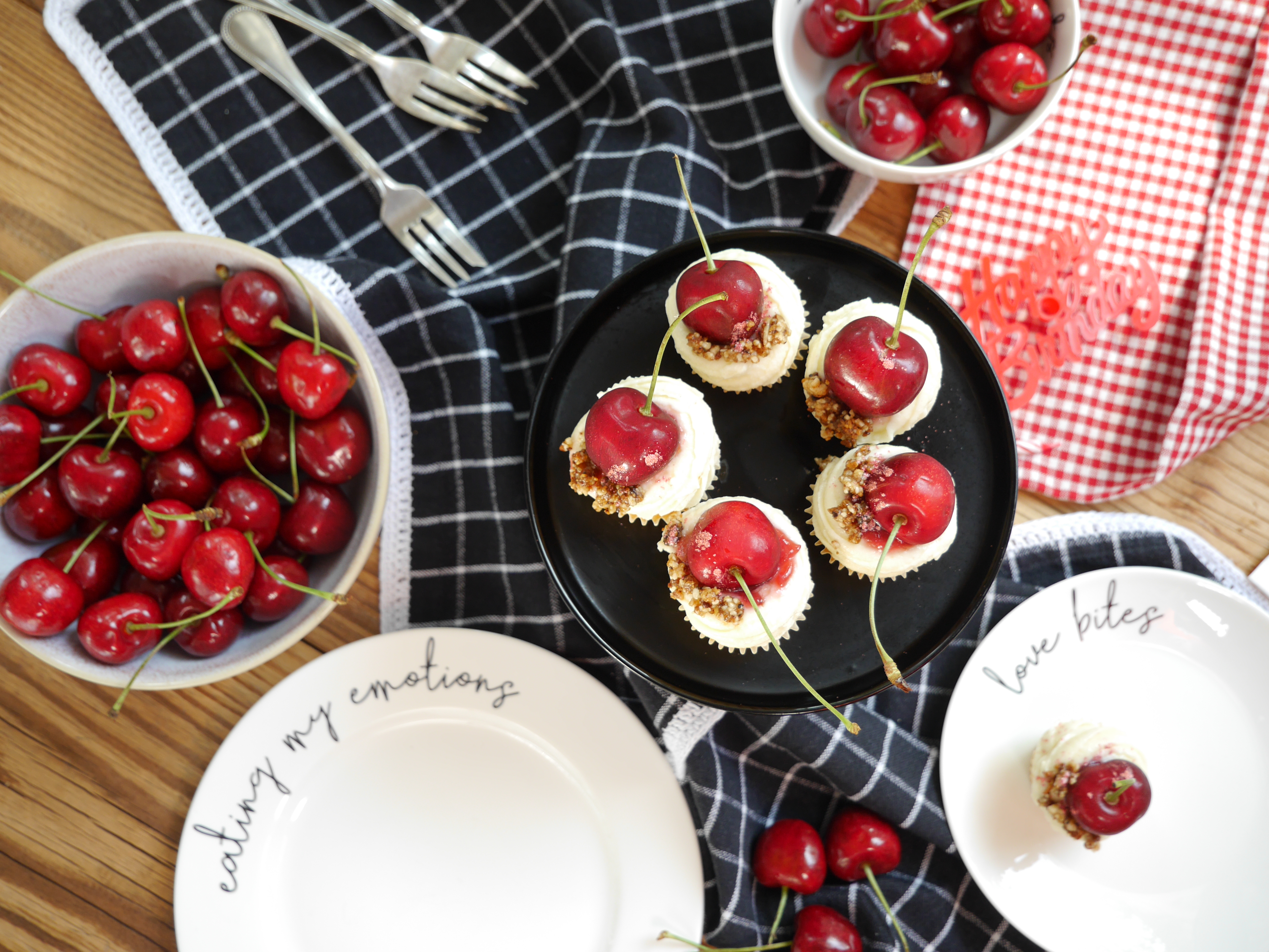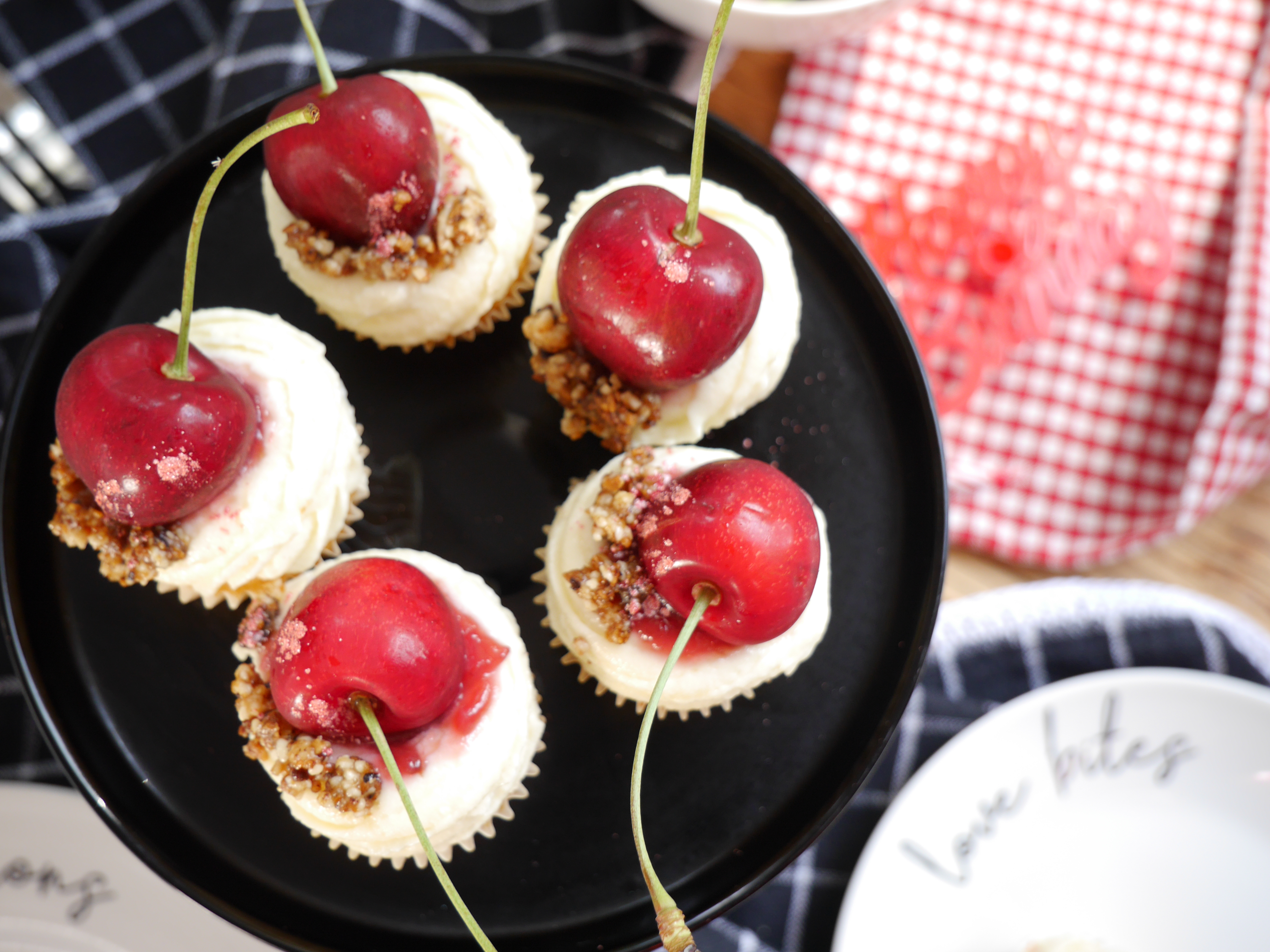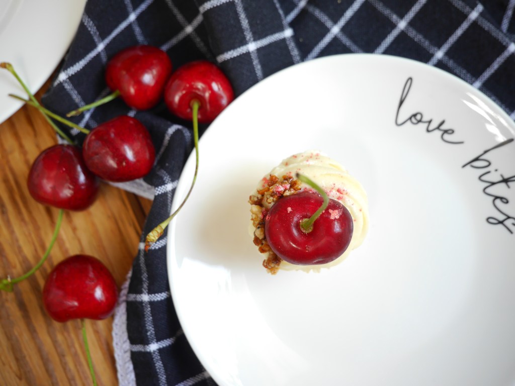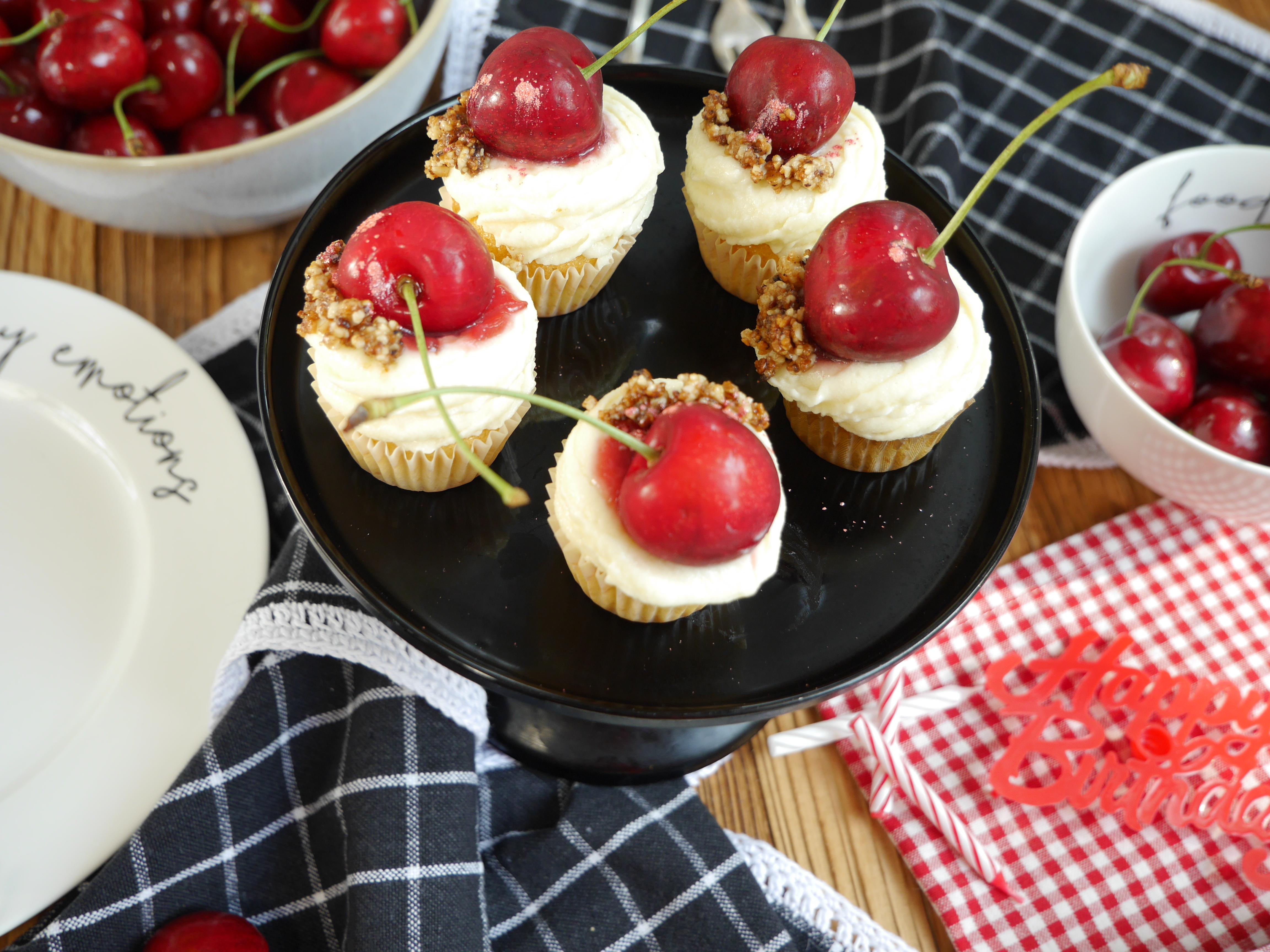 5. Für die Deko jeden Cupcakes mit dem abgekühlten Mandelcrumble bestreuen, eine Kirsche daraufsetzen und ggf. mit Goldpulver verzieren.