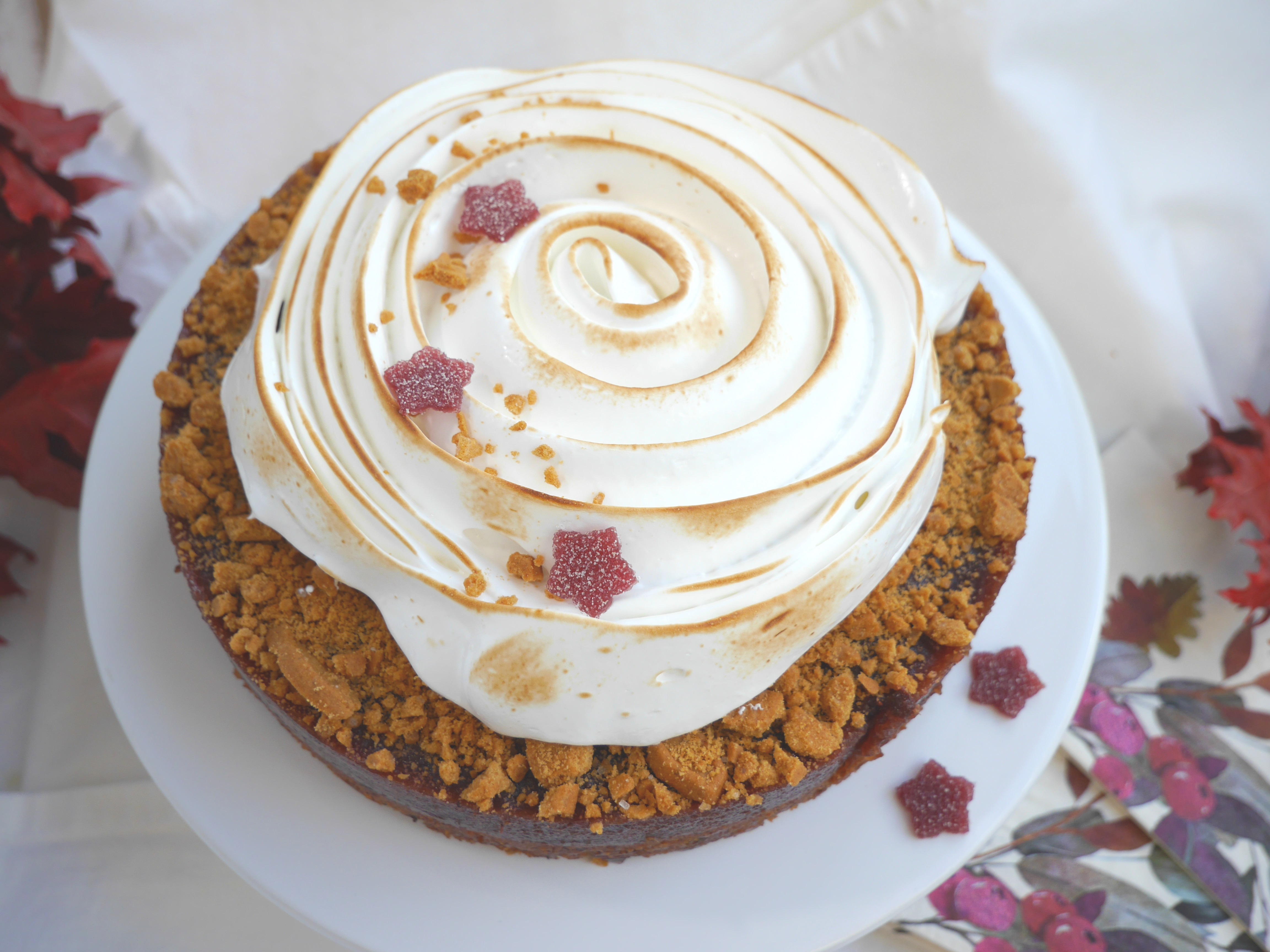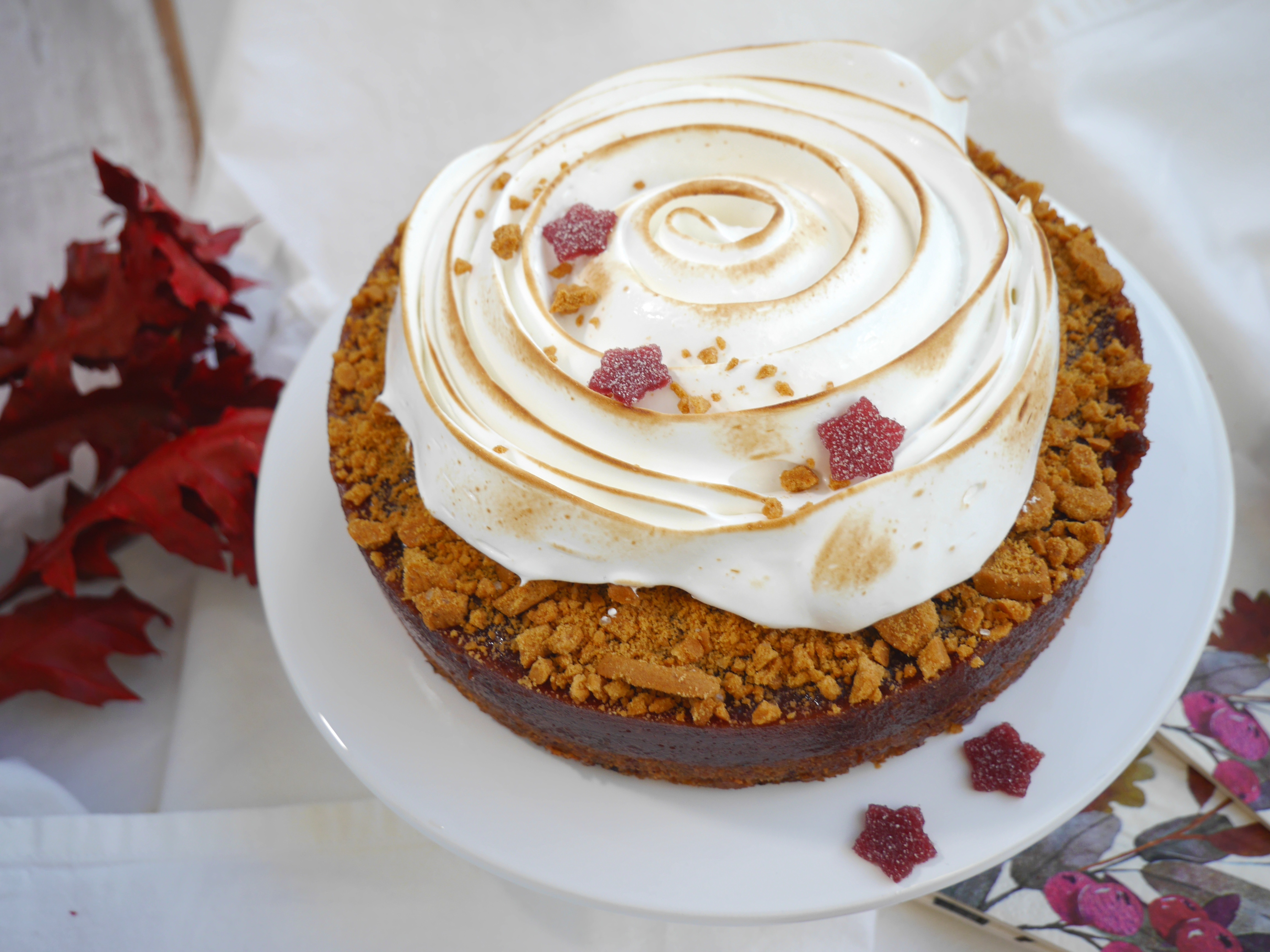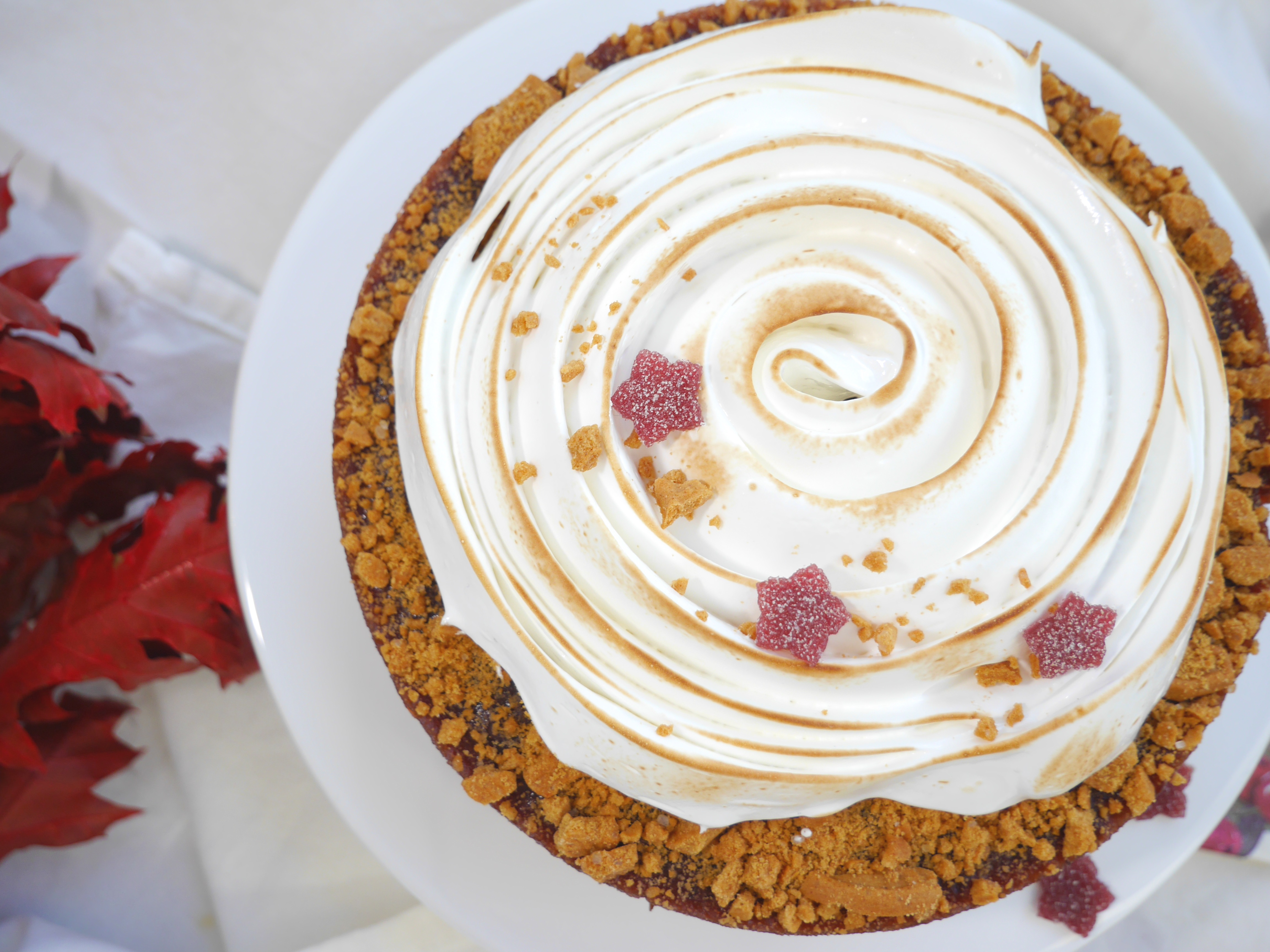 Das fertige Baiser in zwei Spritzbeutel mit verschiedenen Spritztüllen füllen und den Kuchen damit dekorieren. Abschließend mit einem Küchen-Bunsenbrenner flambieren.