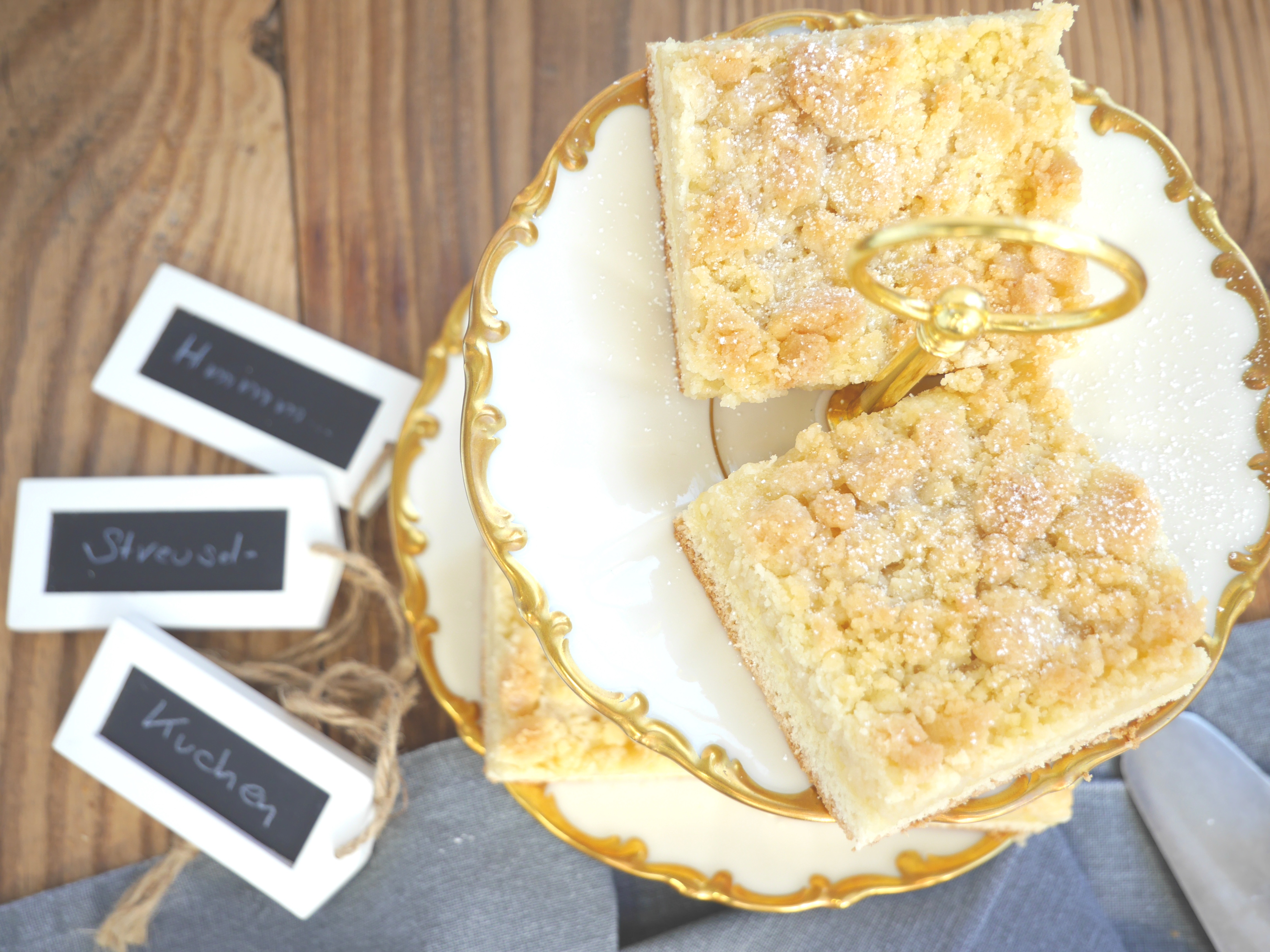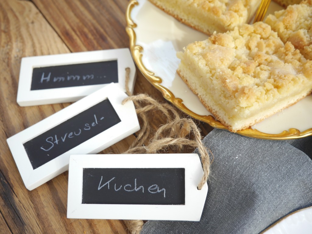 2. Für die Streusel alle Zutaten verkneten und auf dem fertigen Boden verteilen. Den Kuchen bei 180 Grad Umluft ca. 25 Minuten blass ausbacken.