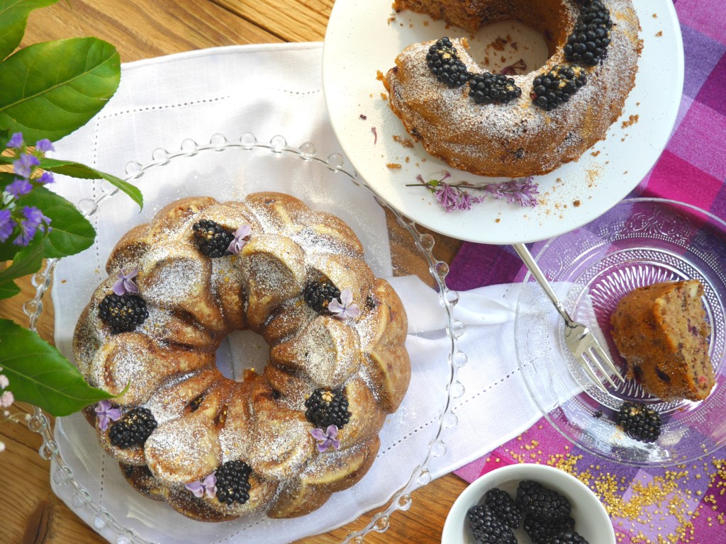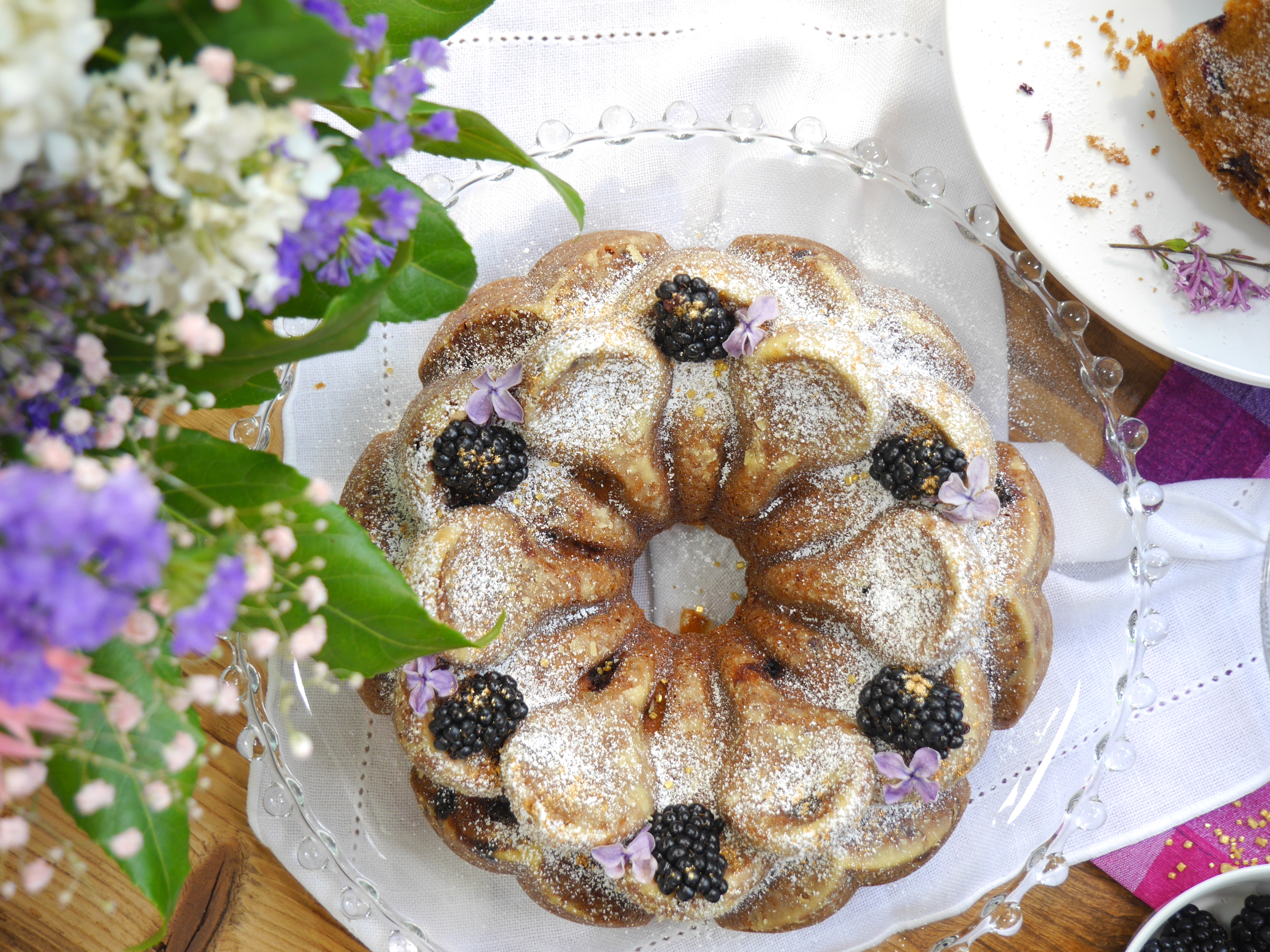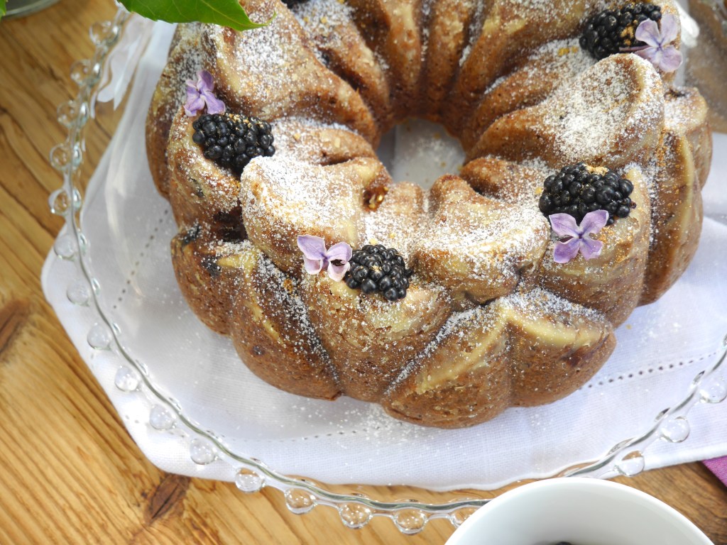 2. Für die Deko den Gugel mit Puderzucker, frischen halbierten Brombeeren und ggf. etwas essbaren Glitter dekorieren.