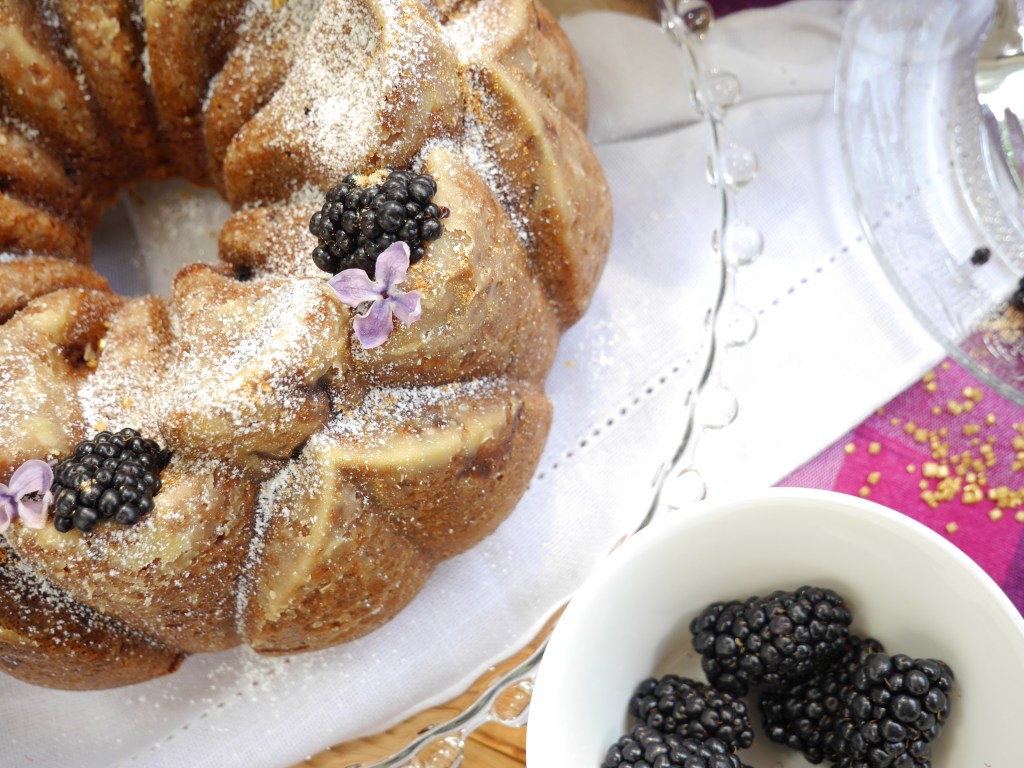 Den fertigen Teig in eine gefettete und mit Mehl bestäubte Gugelhupfform (ca. 28 cm Durchmesser) füllen und bei 180 Grad Ober-/Unterhitze im vorgeheizten Backofen für ca. 65 Minuten goldgelb ausbacken. Vollständig abkühlen lassen und stürzen.
