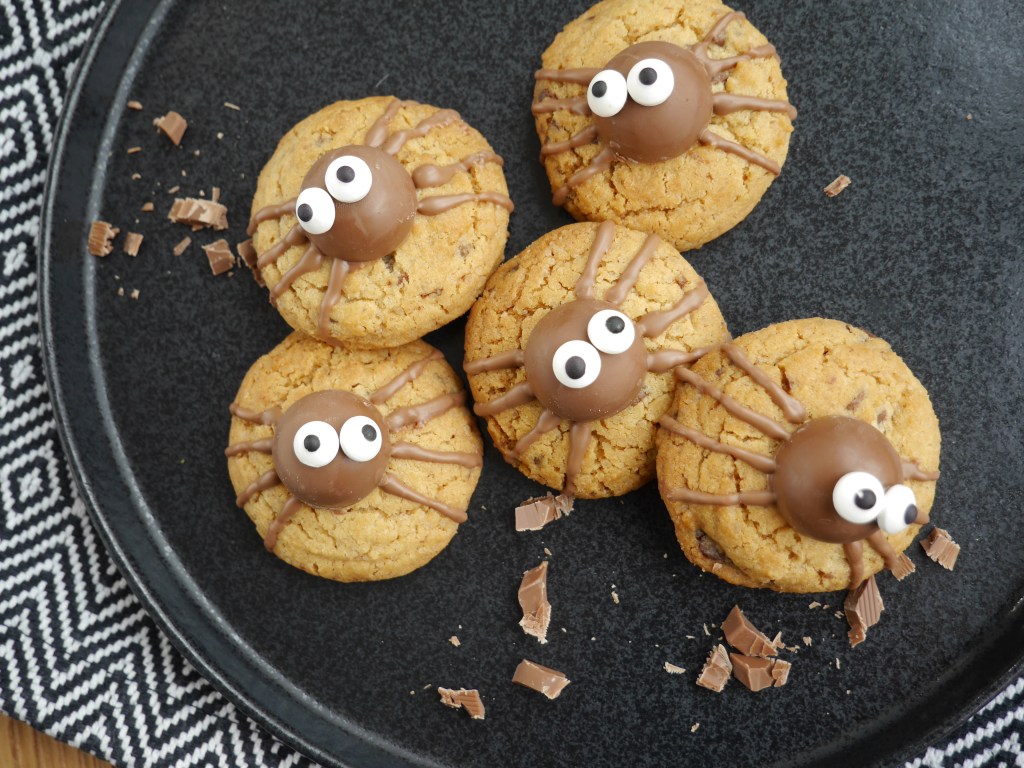 Jeweils eine Halbkugel auf einen lauwarmen Cookie setzen. Aus der restlichen geschmolzenen Schokolade mit Hilfe eines kleinen Löffels oder Spritzbeutels die Spinnenbeine auf die Cookies malen.