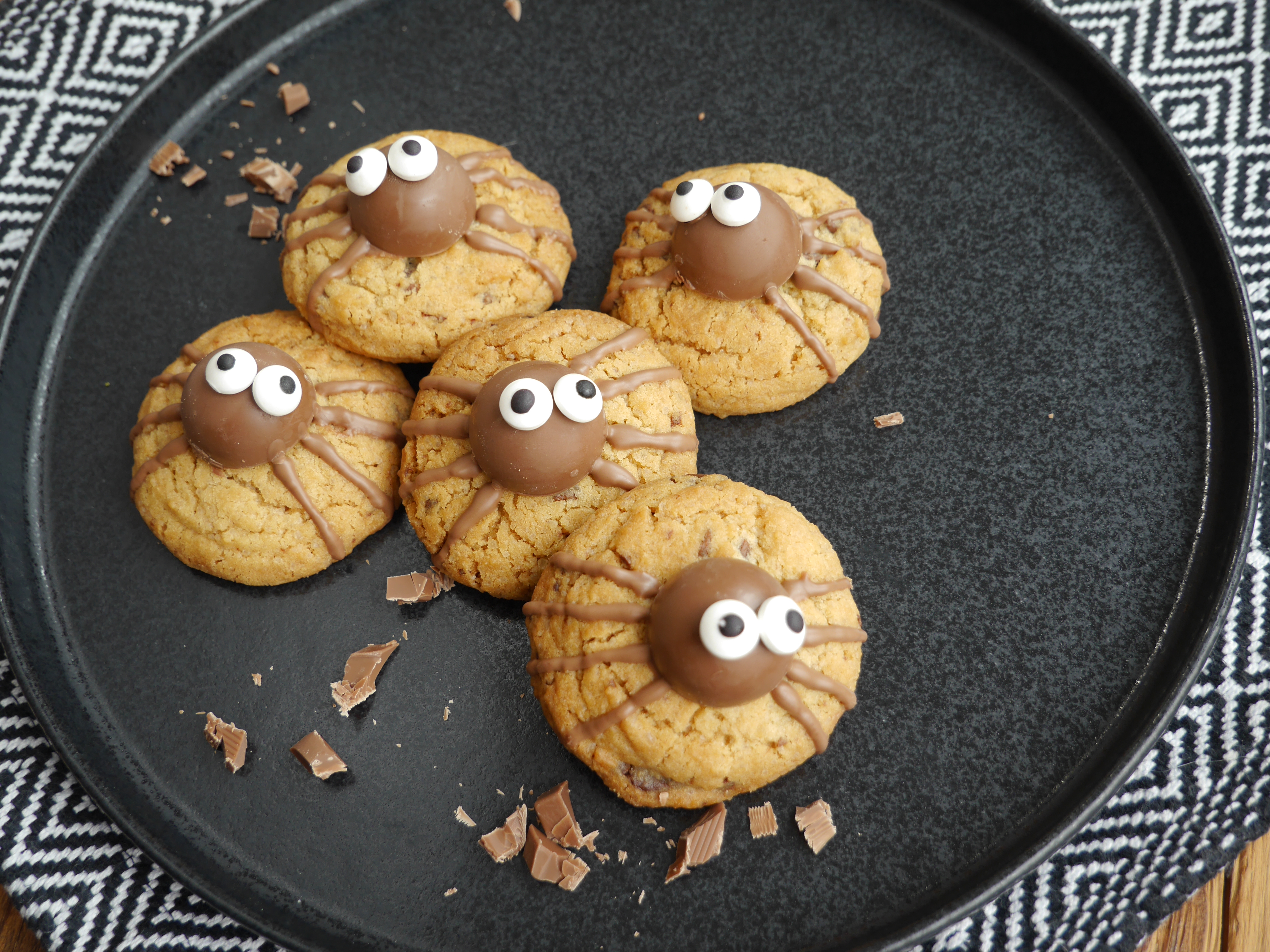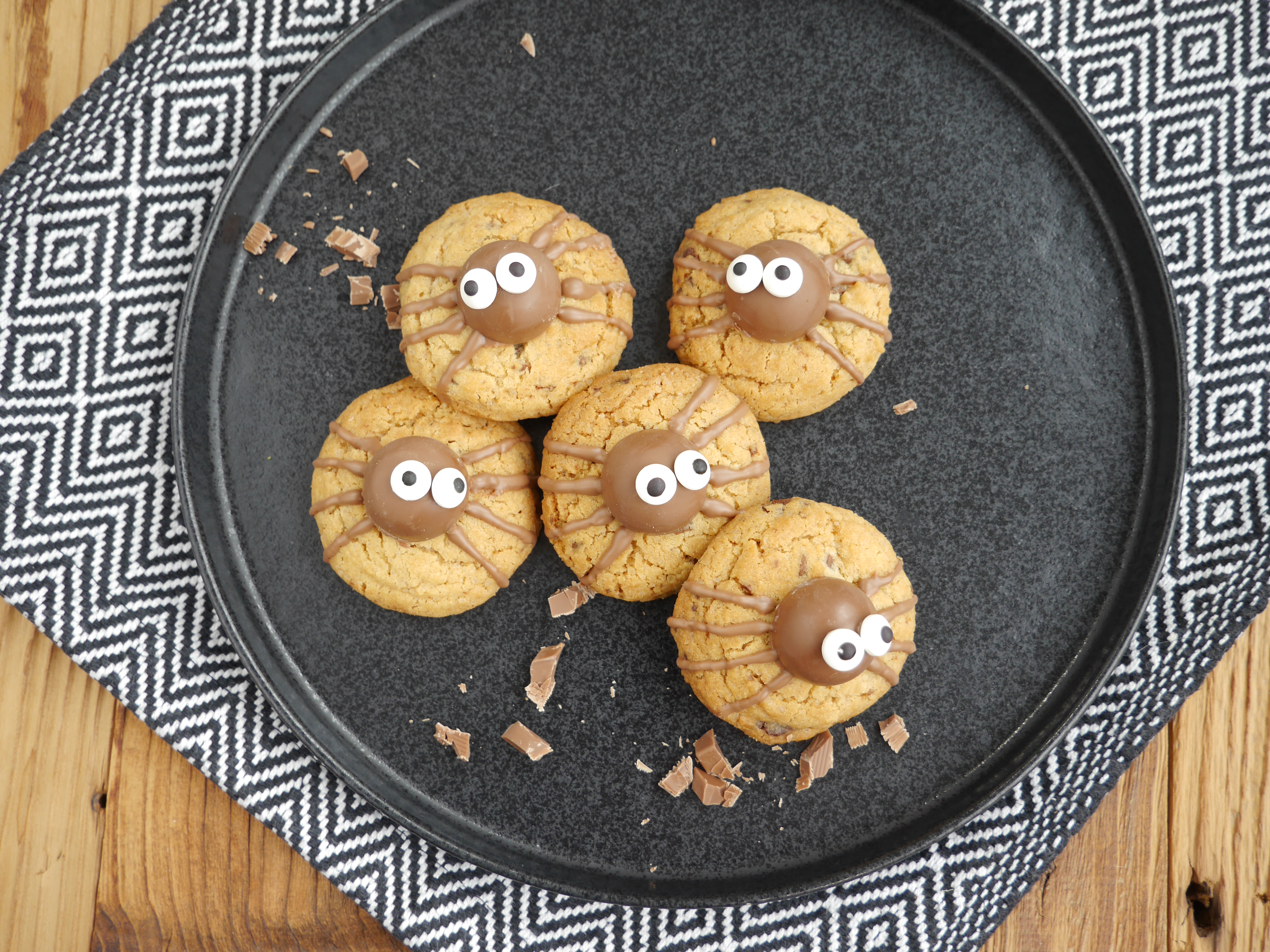 Jeweils eine Halbkugel auf einen lauwarmen Cookie setzen. Aus der restlichen geschmolzenen Schokolade mit Hilfe eines kleinen Löffels oder Spritzbeutels die Spinnenbeine auf die Cookies malen.