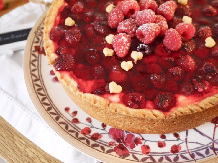 1.Für den Mürbeteig alle Zutaten zu einem glatten Teig verkneten und auf einer bemehlten Arbeitsfläche so ausrollen, dass der Boden und 5 cm vom Rand der Springform (24 cm Durchmesser) bedeckt sind. Den Teig in die Form geben, andrücken und mit einer Gabel einstechen. Mit einem Löffelstiel ein Muster in den Rand drücken und den Teig für 30 Minuten kühlen. Aus übrigen Teigresten kleine Herzen ausstechen und ebenfalls kühlen.