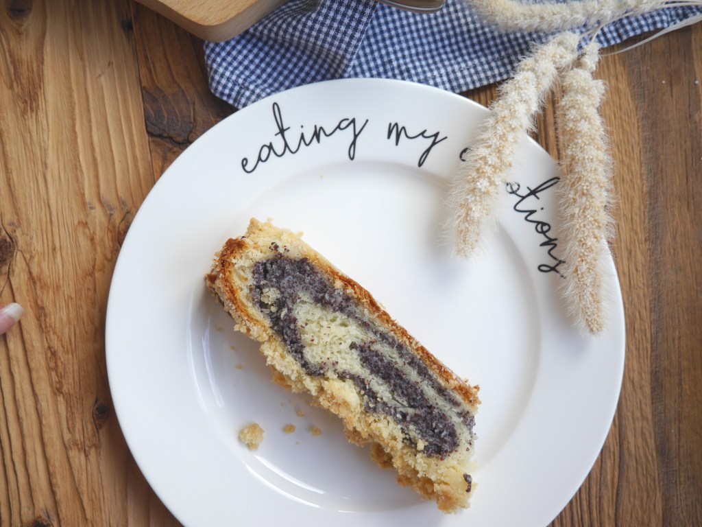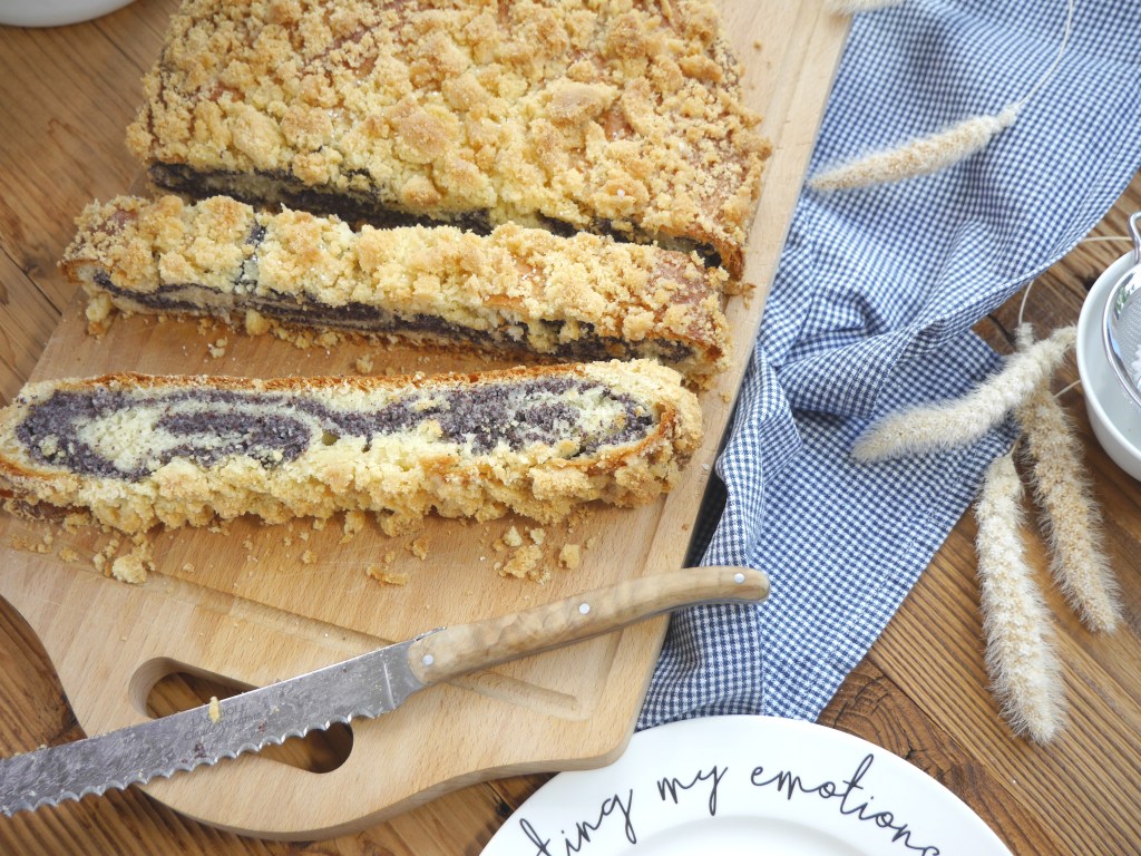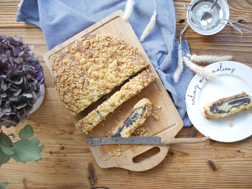 Den fertigen Hefeteig auf einer bemehlten Arbeitsfläche zu einem Rechteck (ca. 50 x 60 cm) ausrollen und mit der abgekühlten Mohnmasse bestreichen. Ringsum sollte ein Rand von ca. 2 cm frei bleiben. Den Teig von beiden langen Seite her aufrollen zur Mitte hin aufrollen. Die Rollen leicht gegeneinanderdrücken. Den Striezel auf ein mit Backpapier belegtes Backblech legen und leicht mit etwas Wasser bestreichen. Die Streusel darauf verteilen und nochmal 10 Minuten gehen lassen.