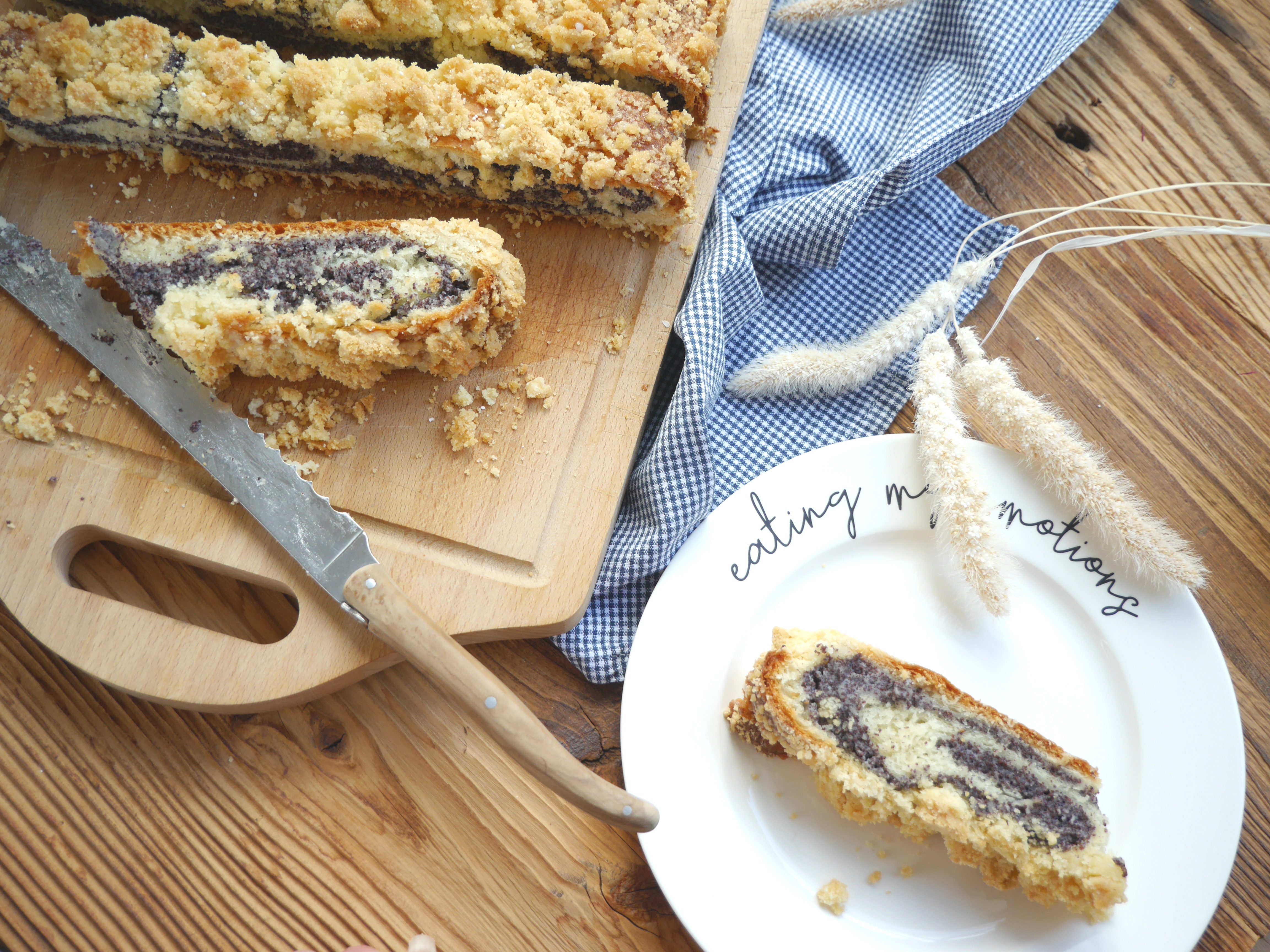 Den fertigen Hefeteig auf einer bemehlten Arbeitsfläche zu einem Rechteck (ca. 50 x 60 cm) ausrollen und mit der abgekühlten Mohnmasse bestreichen. Ringsum sollte ein Rand von ca. 2 cm frei bleiben. Den Teig von beiden langen Seite her aufrollen zur Mitte hin aufrollen. Die Rollen leicht gegeneinanderdrücken. Den Striezel auf ein mit Backpapier belegtes Backblech legen und leicht mit etwas Wasser bestreichen. Die Streusel darauf verteilen und nochmal 10 Minuten gehen lassen.