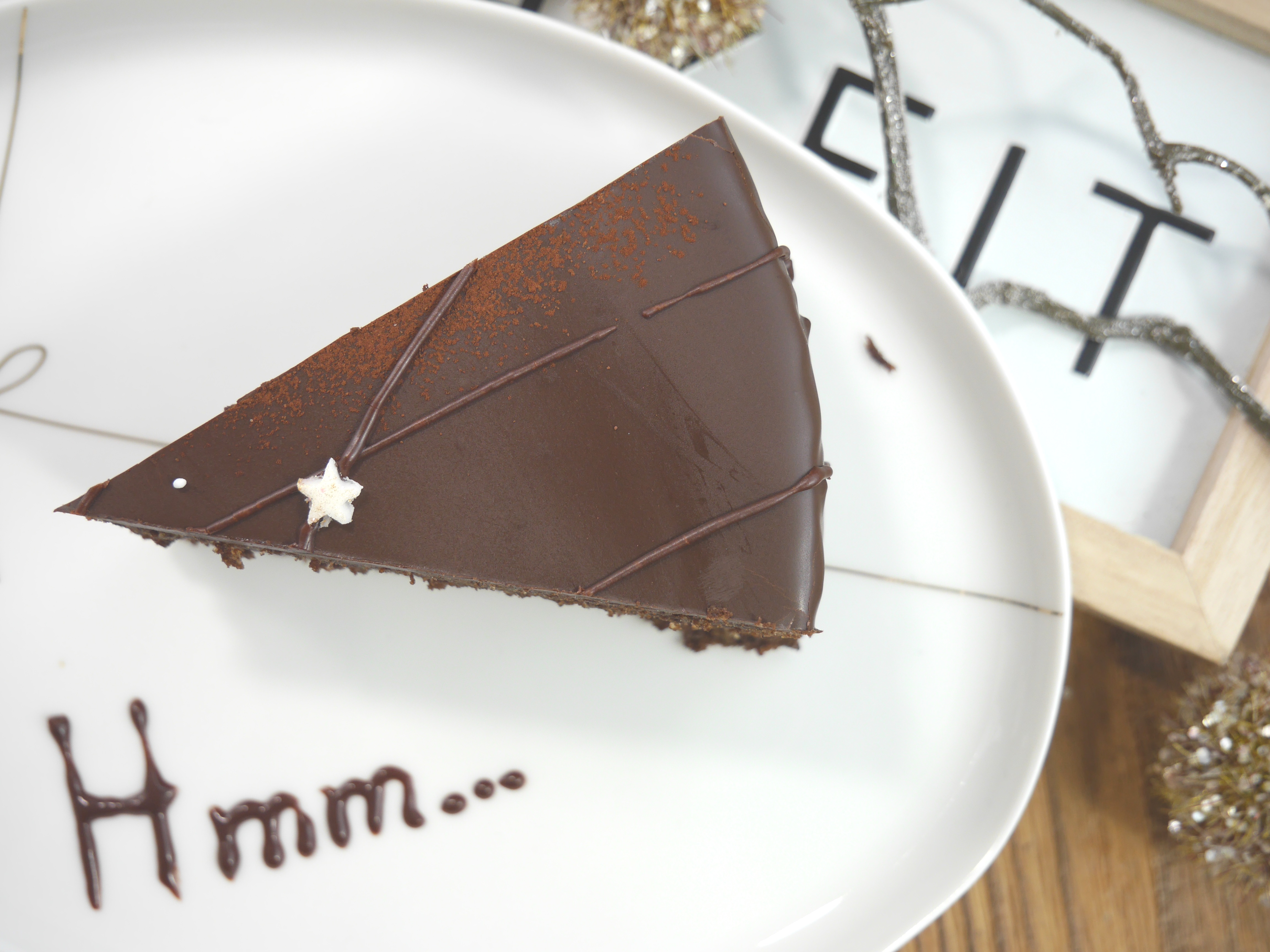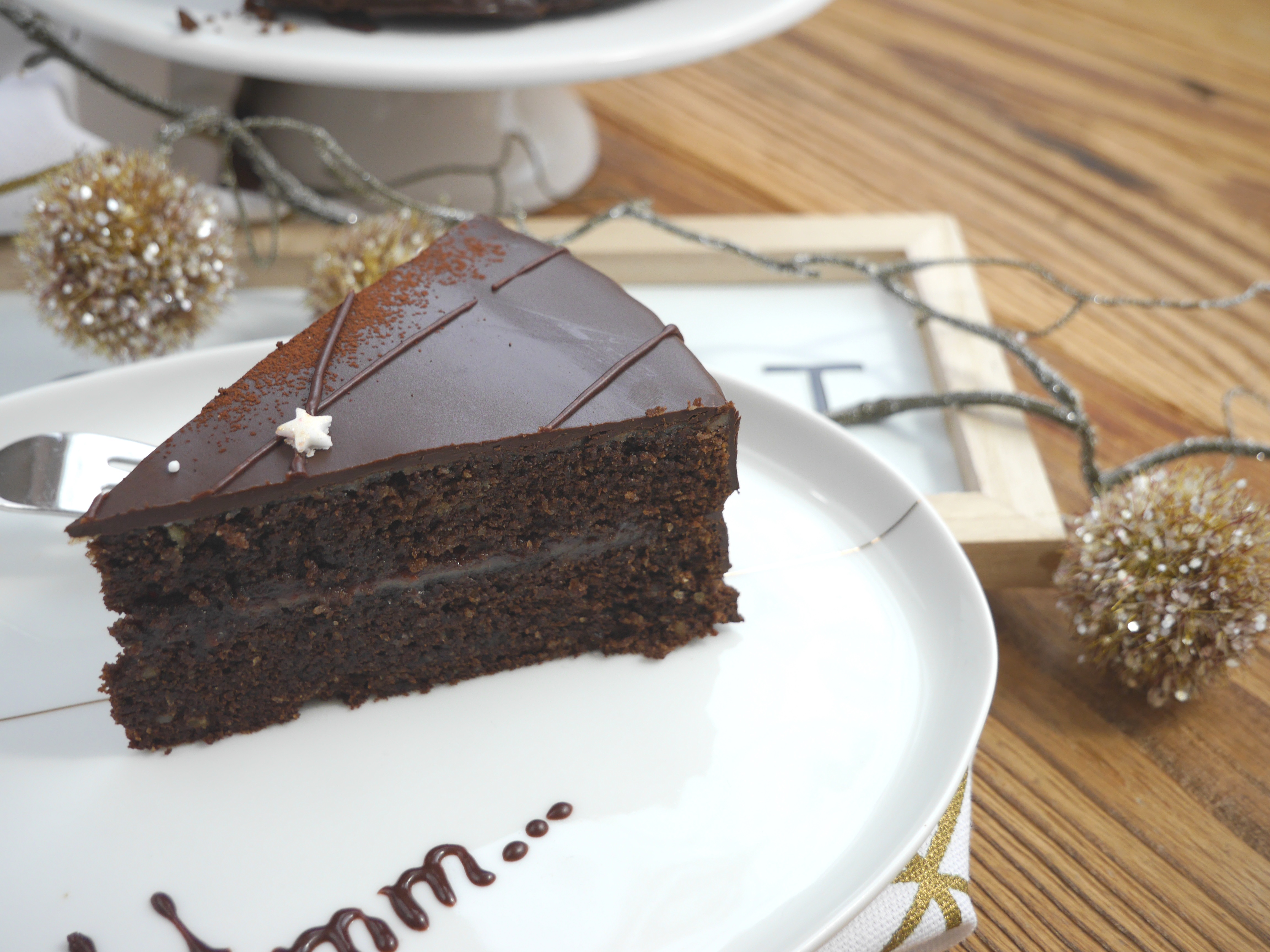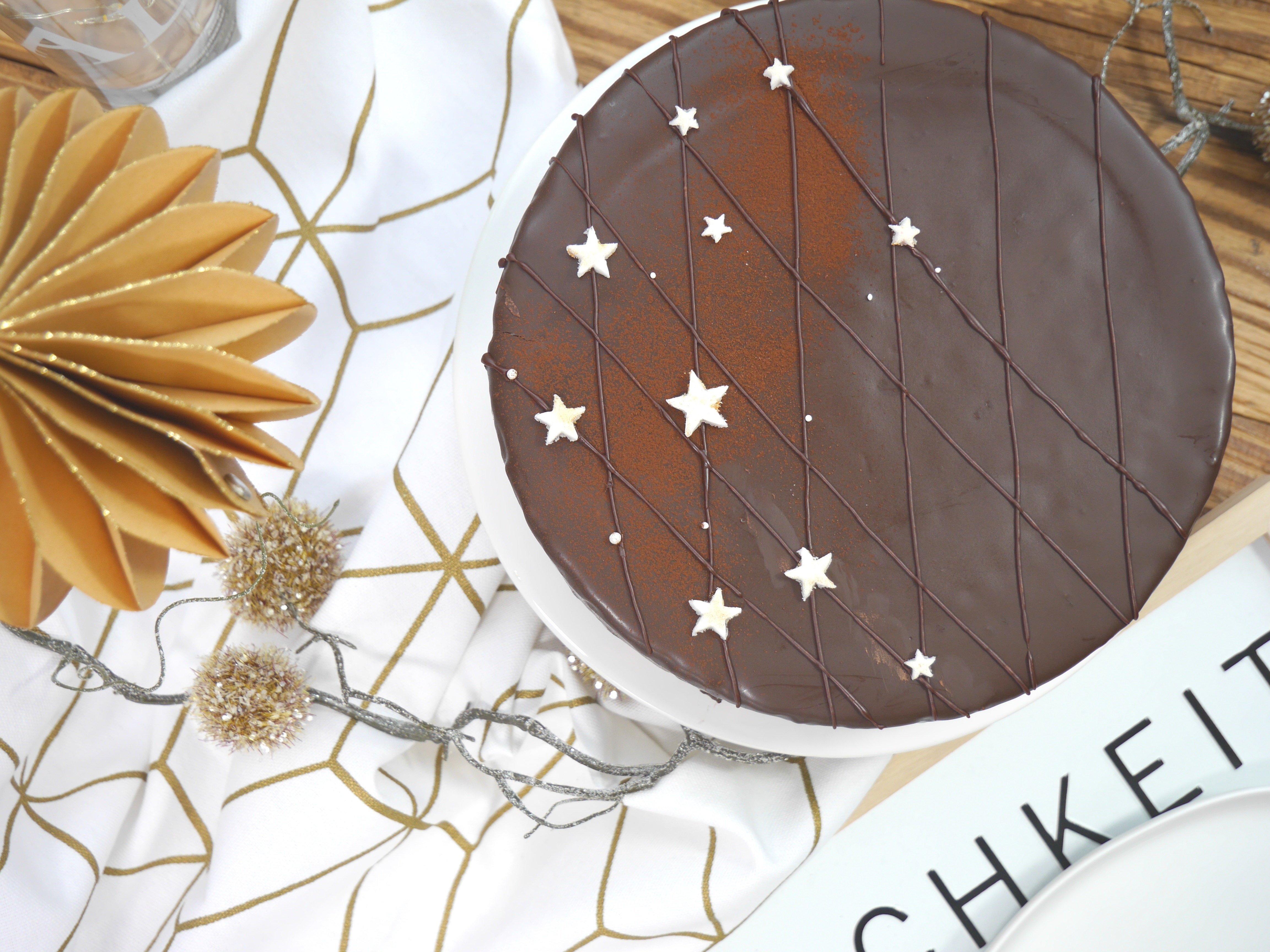 4. Für die Deko den Puderzucker mit dem Backkakao mischen und mit wenig Wasser zu einer Spritzfähigen Masse rühren. In einen Spritzbeutel füllen und den Kuchen damit verzieren. Zum Schluss nach Belieben mit den Fondantsternen dekorieren.
