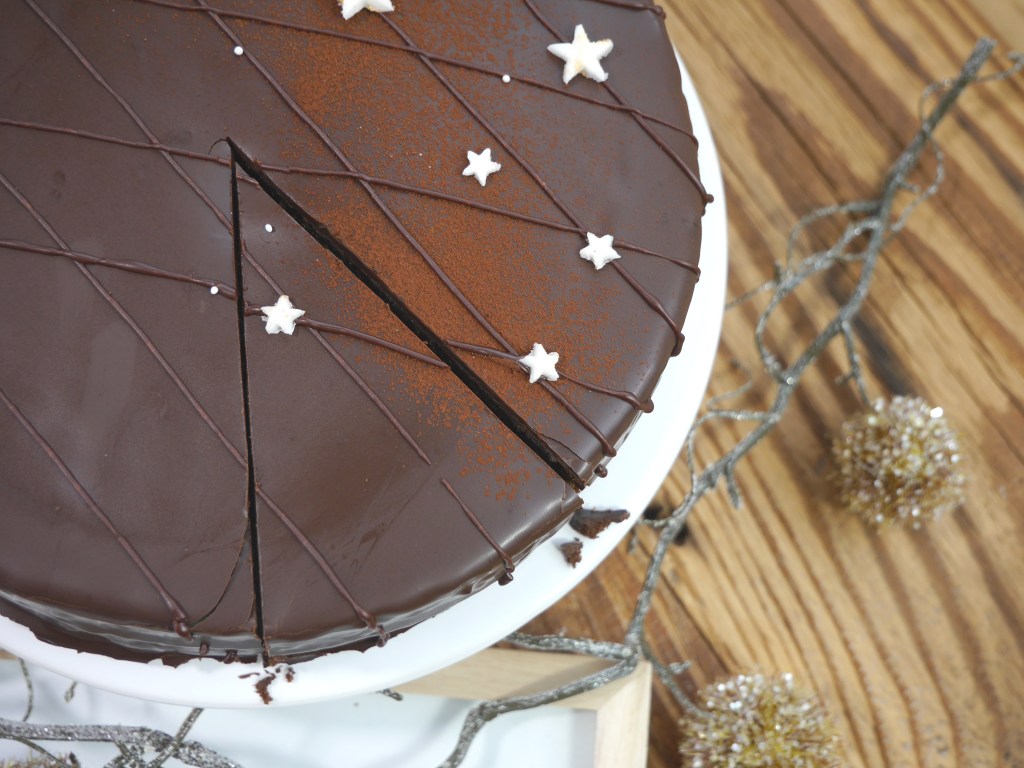3. Für die Glasur die Glasur im Wasserbad schmelzen und den Kuchen damit übergießen, sodass er gleichmäßig ummantelt ist. Abkühlen lassen.