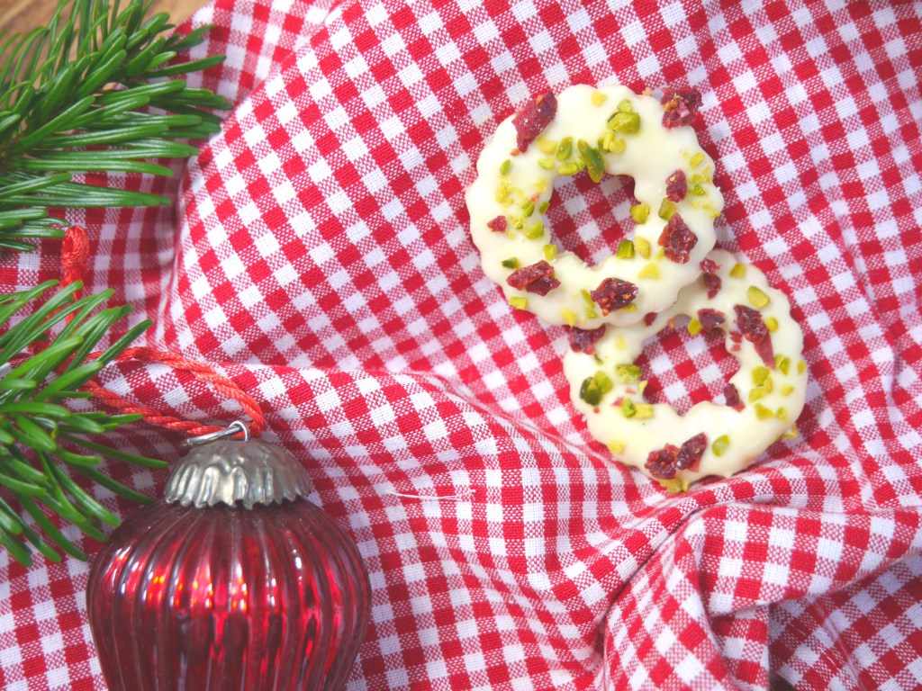 Die abgekühlten Kränzchen kopfüber leicht in die Schokolade tunken, sodass die Oberseite bedeckt ist. Auf ein Abtropfgitter legen und sofort mit den gehackten Pistazien und den Cranberries bestreuen. Vollständig trockenen lassen.