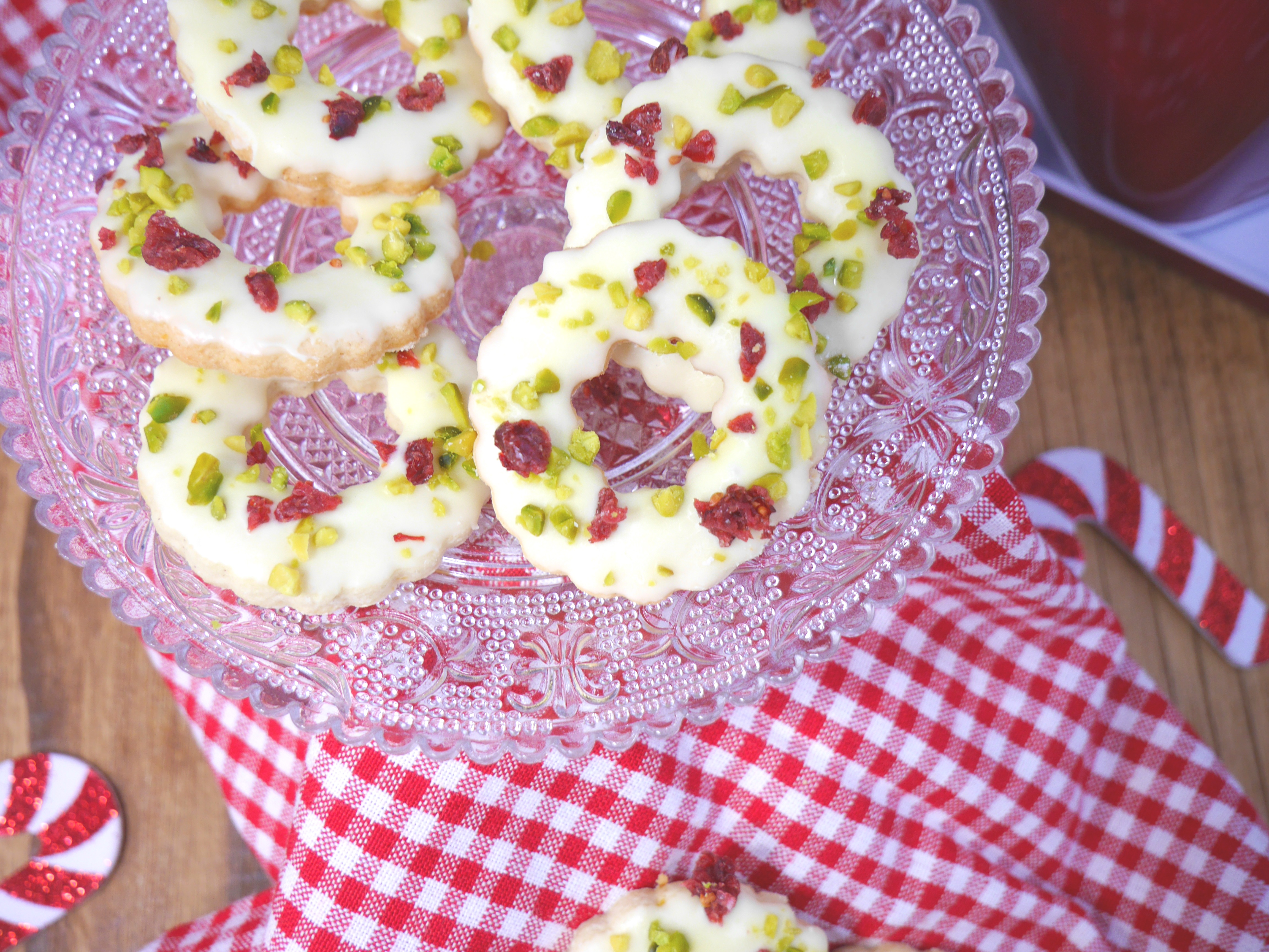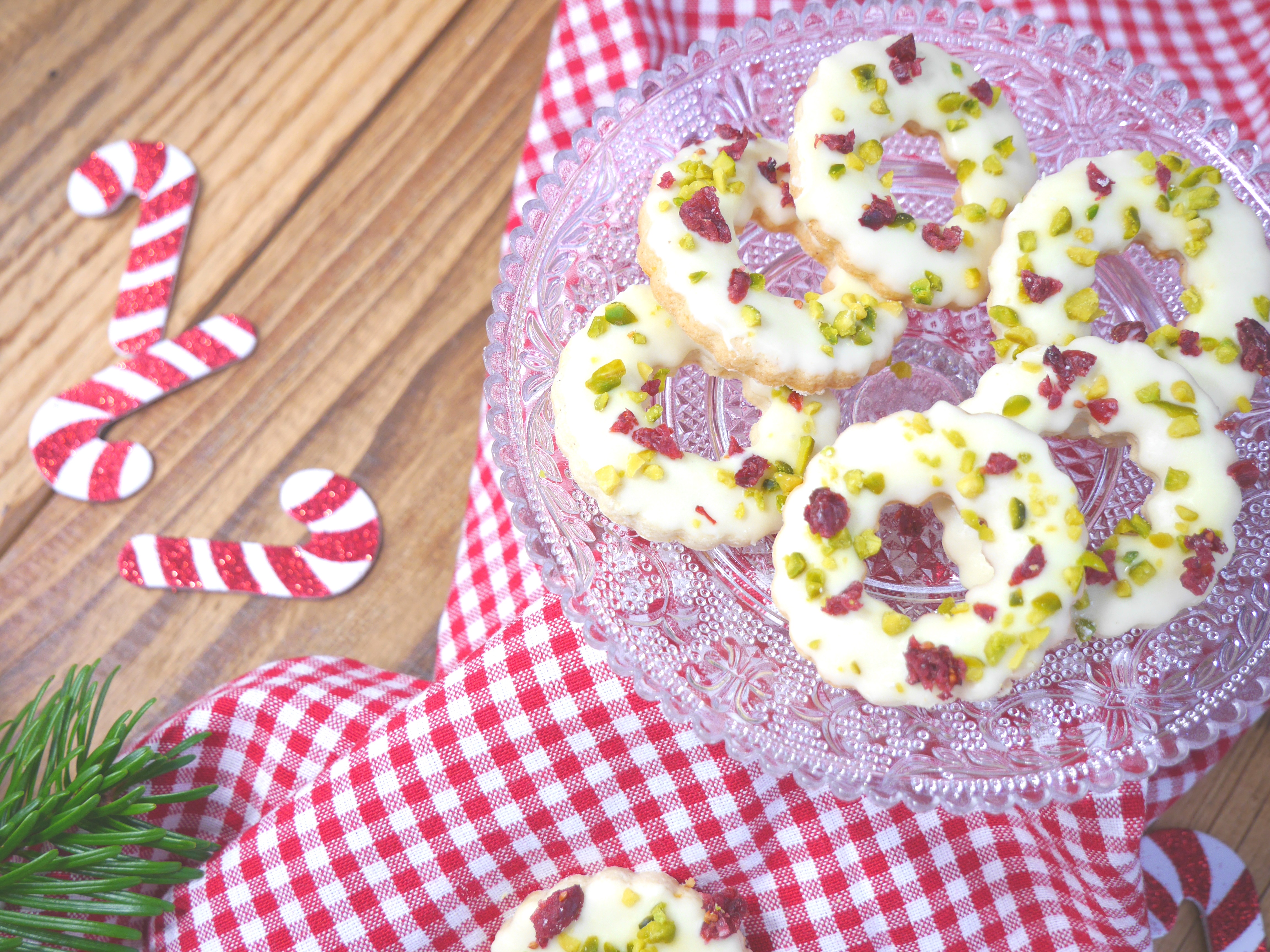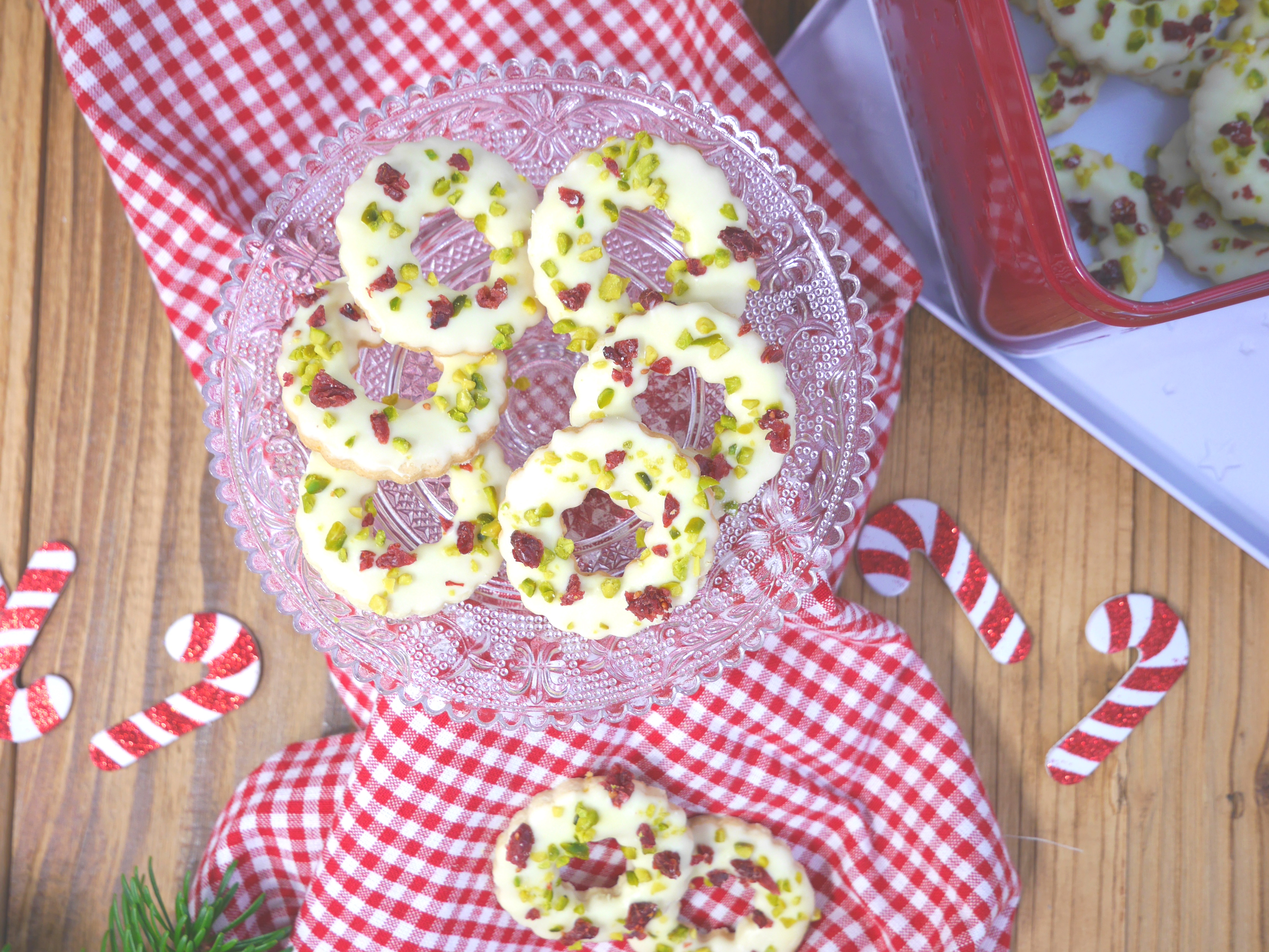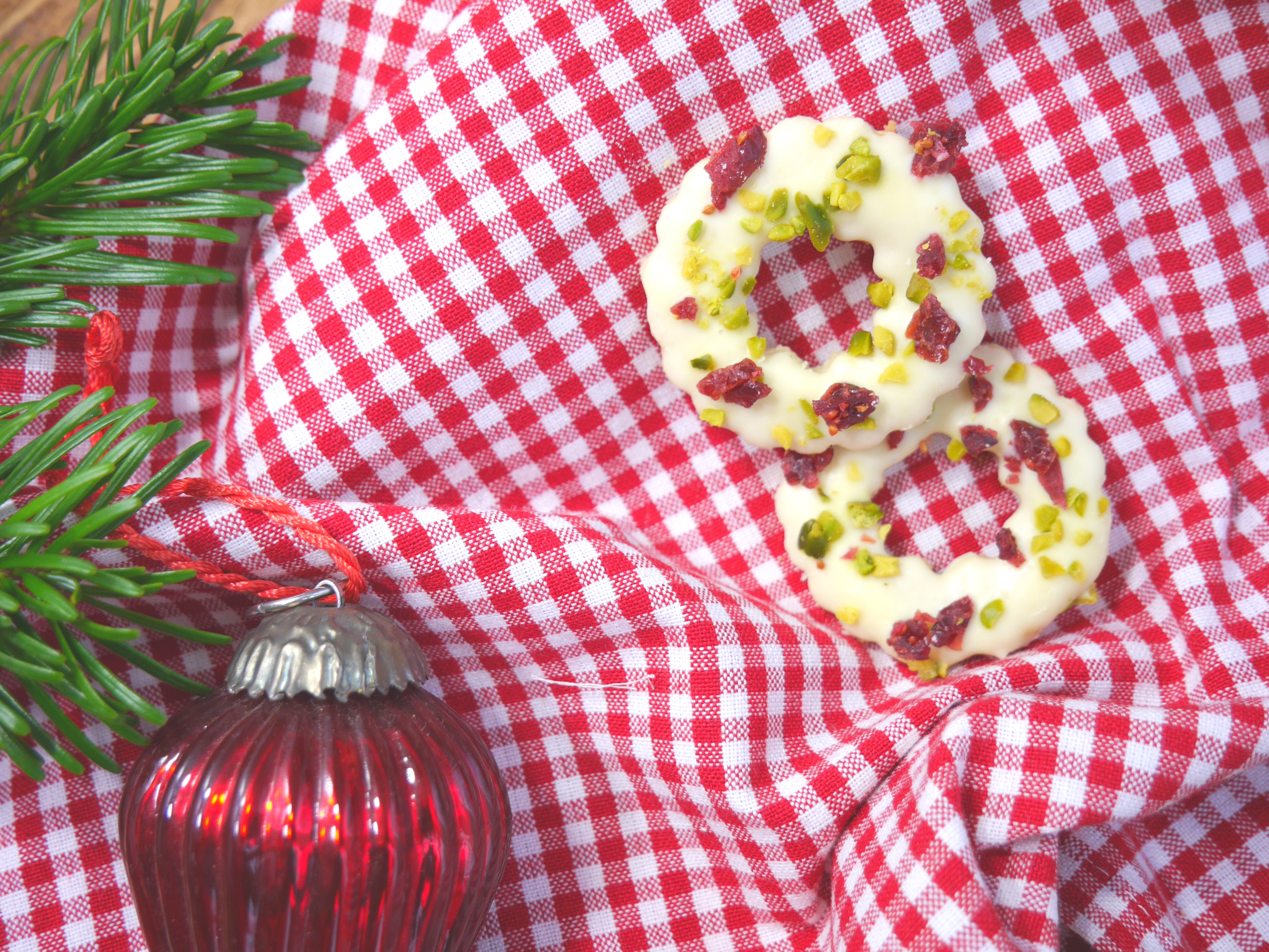Die abgekühlten Kränzchen kopfüber leicht in die Schokolade tunken, sodass die Oberseite bedeckt ist. Auf ein Abtropfgitter legen und sofort mit den gehackten Pistazien und den Cranberries bestreuen. Vollständig trockenen lassen.