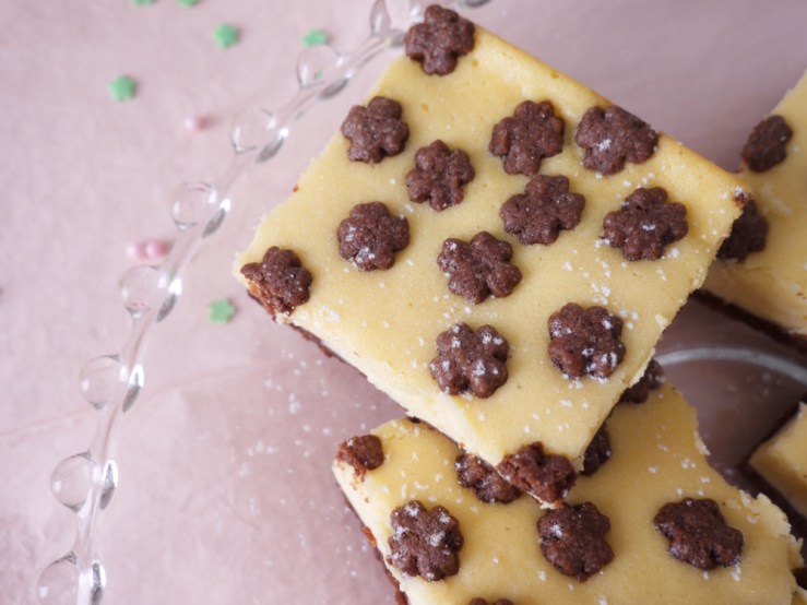 1. Für den Teig alle Zutaten gut vermischen bis ein glatter Teig entsteht. Ein Backblech mit Backpapier belegen (am besten über den Rand) und aus zwei Drittel des Teiges einen gleichmäßigen Boden ohne Rand formen. Den restlichen Teig kurz kühlen.