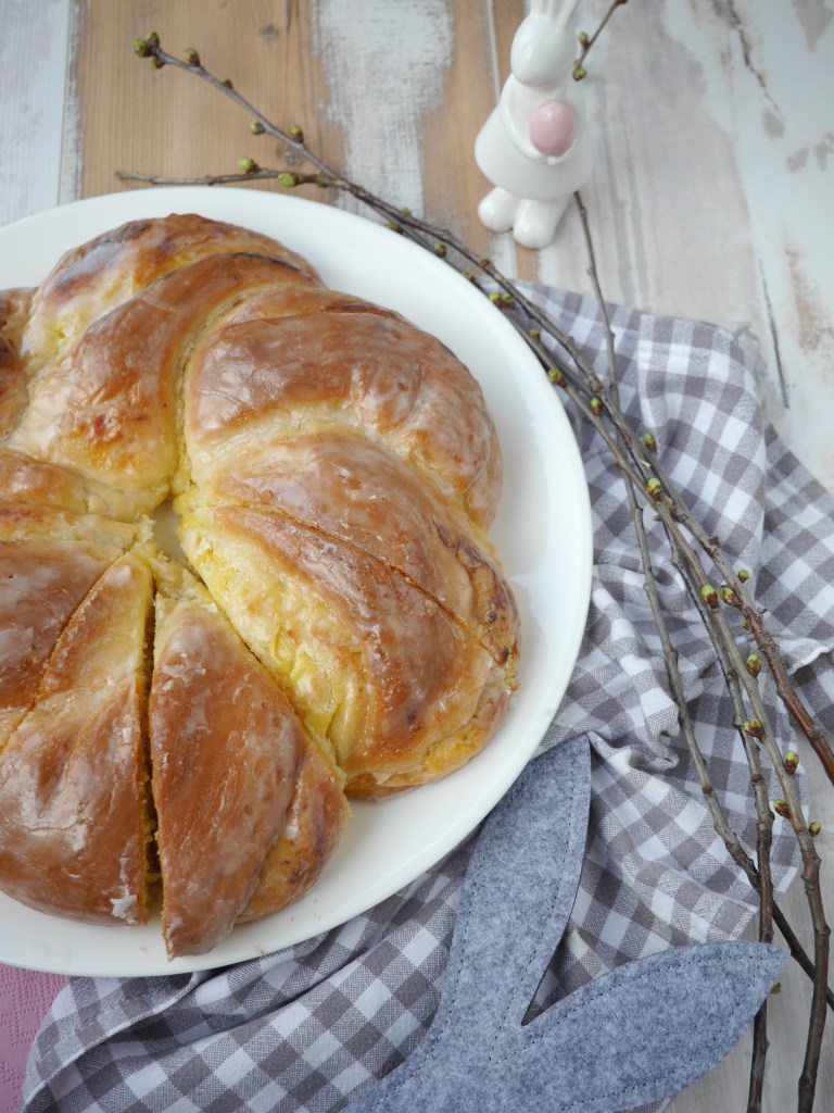 Die Enden andrücken und den fertigen Kranz auf ein mit Backpapier ausgelegten Backblech legen. Erneut 15 Minuten zugedeckt an einem warmen Ort gehen lassen. Den Kranz bei 175°C Ober-/Unterhitze im vorheizten Backofen 35 Minuten goldbraun backen.