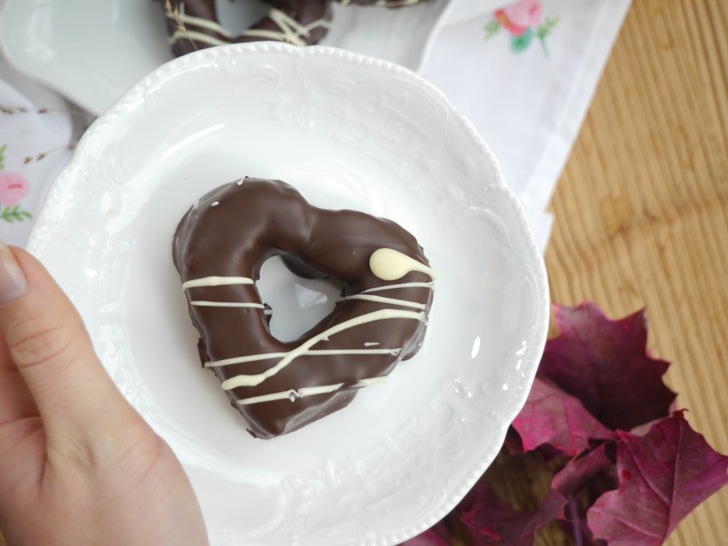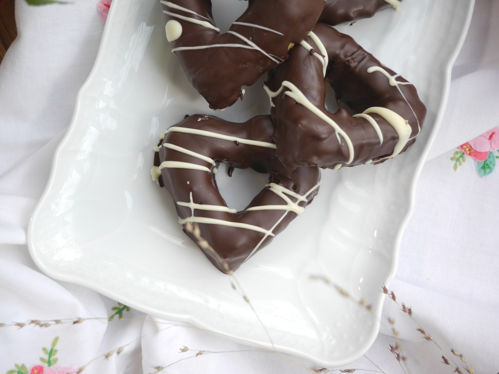 4. Die beiden Kuvertüren getrennt voneinander über dem Wasserbad schmelzen und die Herzen erst mit der Zartbitter-Kuvertüre zügig überziehen und dann mit der weißen Kuvertüre verzieren. Im Kühlschrank 1 Stunde erstarren lassen.