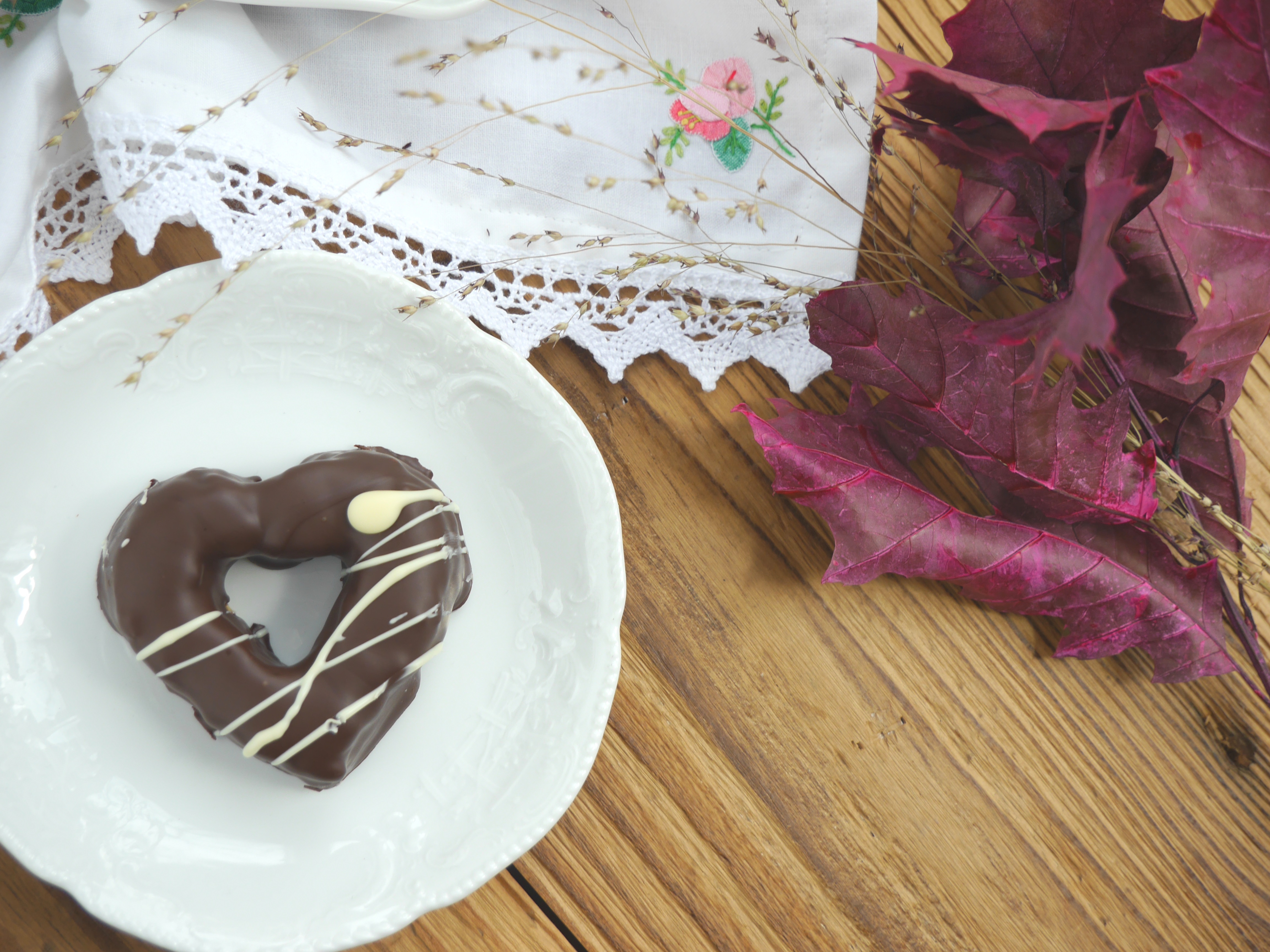 4. Die beiden Kuvertüren getrennt voneinander über dem Wasserbad schmelzen und die Herzen erst mit der Zartbitter-Kuvertüre zügig überziehen und dann mit der weißen Kuvertüre verzieren. Im Kühlschrank 1 Stunde erstarren lassen.