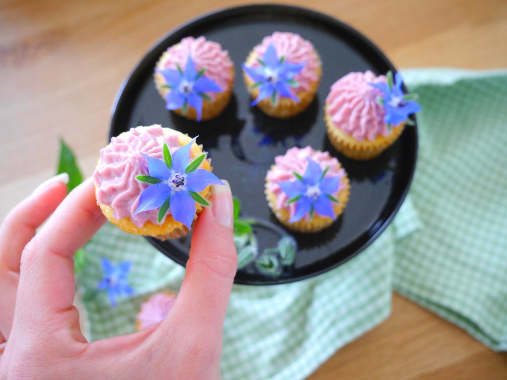 3. Für die Deko jeden Cupcakes nach Belieben mit essbaren Blüten und Glitter dekorieren.