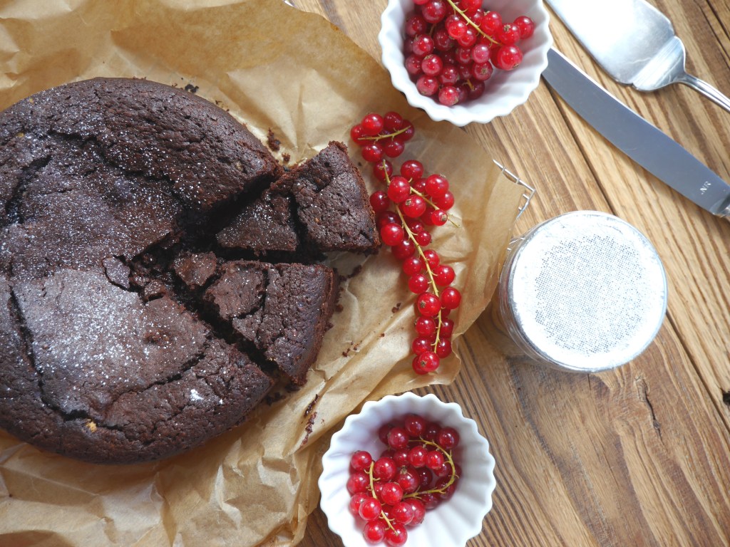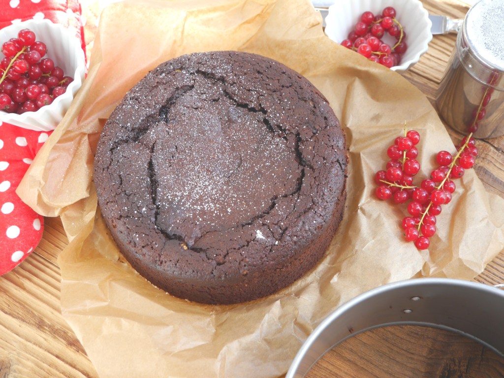 1. Für den Teig die Eier mit dem Zucker und dem Salz lange schaumig schlagen. Die übrigen Zutaten nach und nach unter Rühren dazugeben. Die Johannisbeeren zu Schluss unterrühren und den fertigen teig zügig in einem mit Backpapier ausgelegte und gefettet Springform (22 cm Durchmesser) füllen.