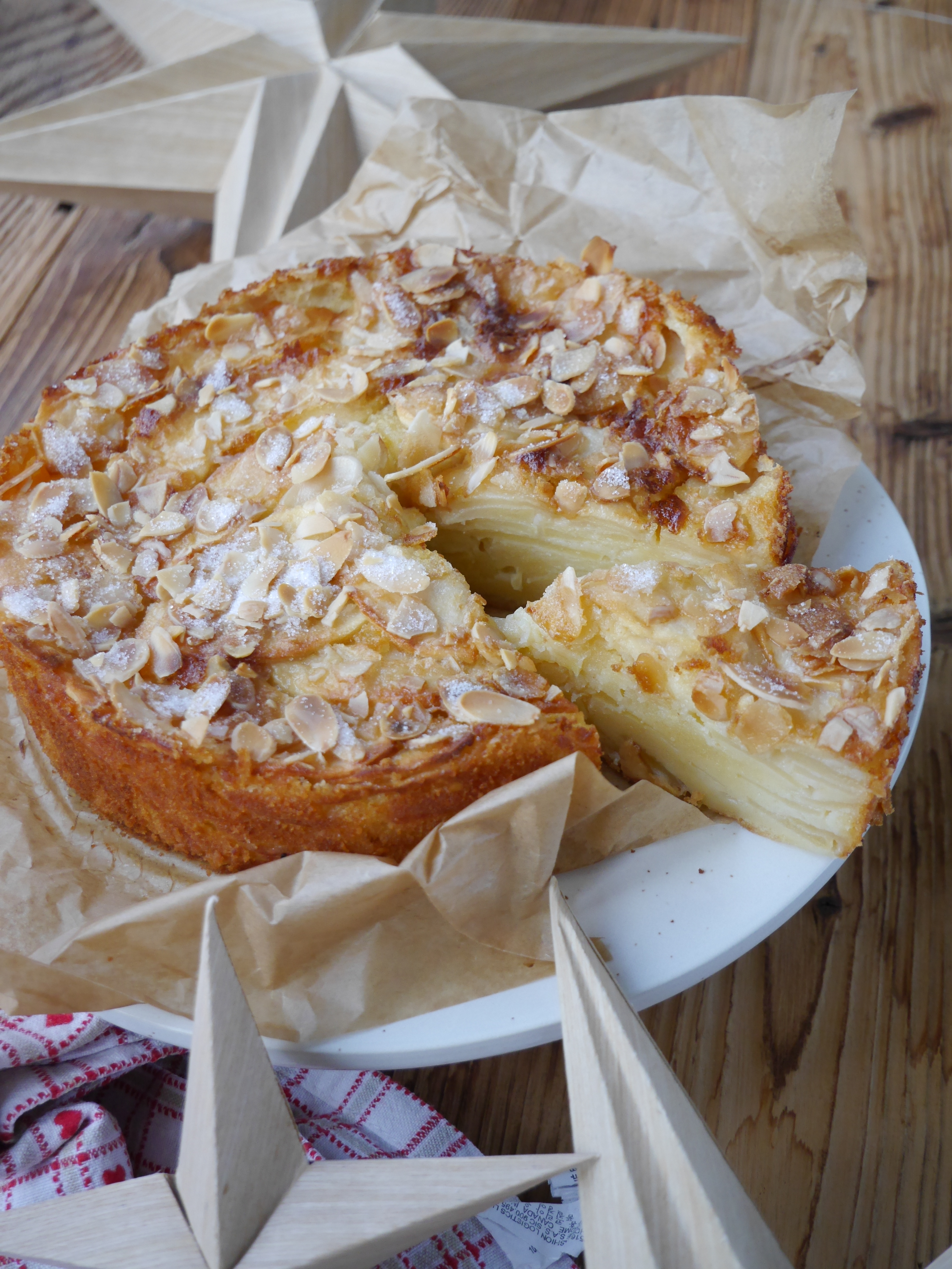 3. Für die Deko den Kuchen erst mit den Mandelblättchen und dann mit dem Zucker bestreuen und im vorgeheizten Backofen 55 Minuten bei 180° Ober-/Unterhitze goldgelb backen.