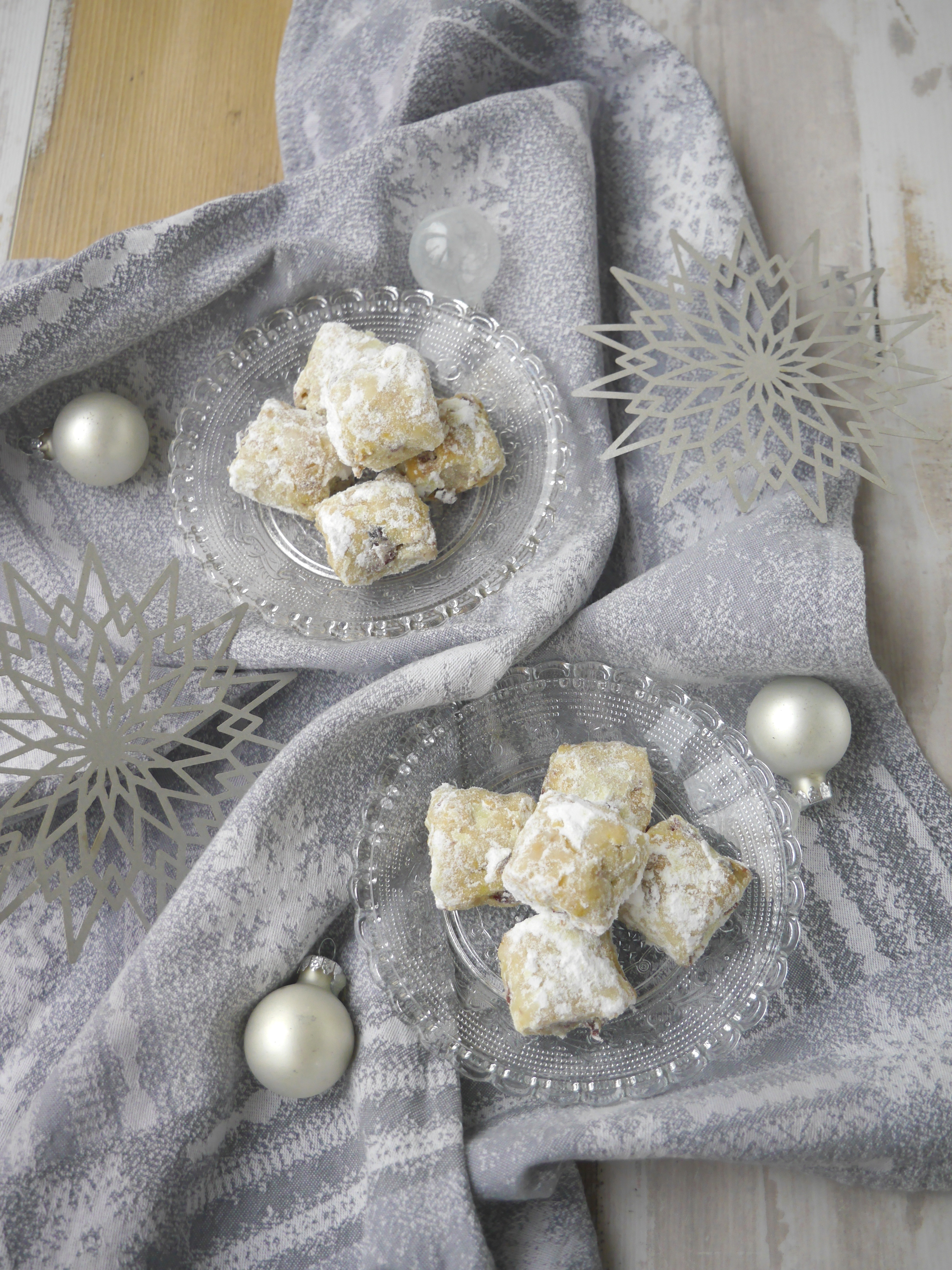 Den fertigen Quarkteig auf einer bemehlten Arbeitsfläche zu einer Rolle (2,5 cm dick) rollen und in gleichgroße Stücke (3 cm) teilen.