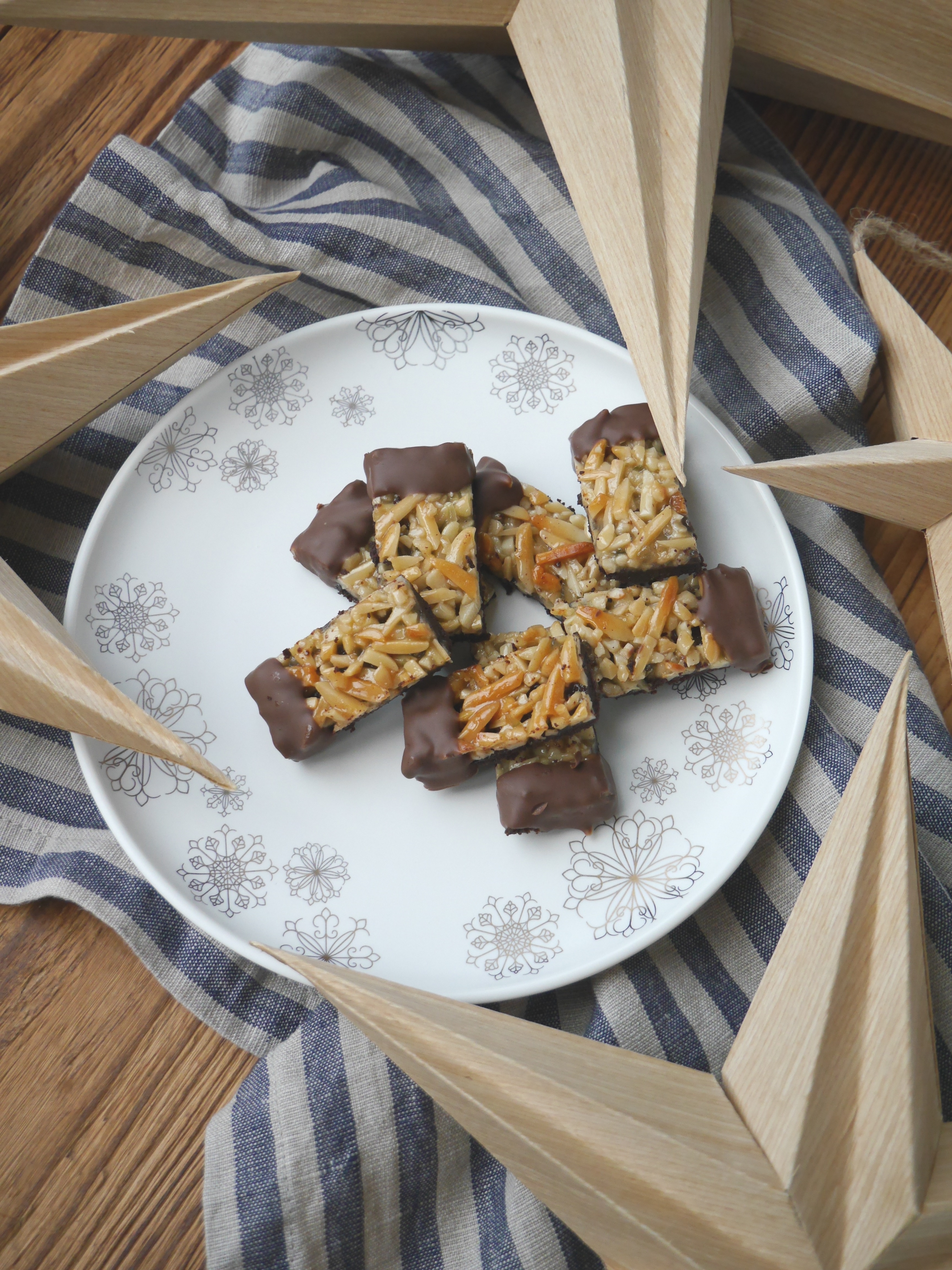 3. Für die Deko die Kuvertüre über dem Wasserbad schmelzen und jedes Rechteck vorsichtig eintunken. Auf einen Abtropfgitter vollständig abkühlen lassen.