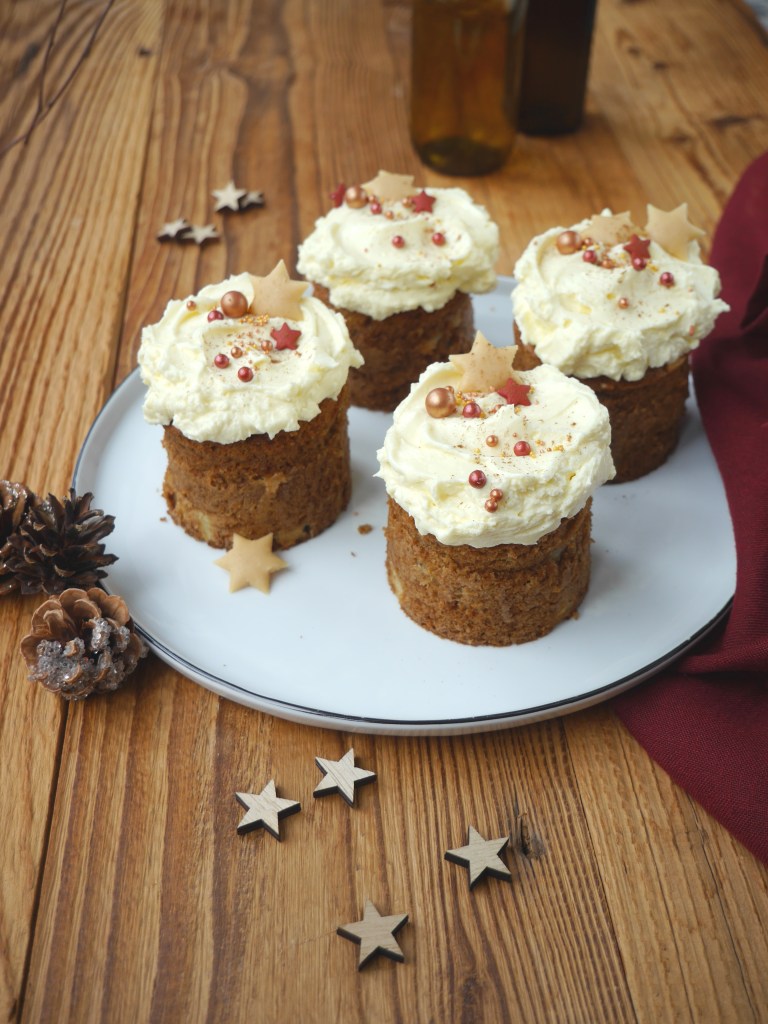 Den Apfel schälen, entkernen und fein würfeln. Die Apfelwürfel unter den Teig heben und den fertigen Teig in 4 gefettete Formen oder Dessertringe (7,5 cm Durchmesser) füllen und im vorgeheizten Backofen bei 180 Grad Ober-/Unterhitze 35 Minuten goldgelb backen. Vollständig abkühlen lassen.