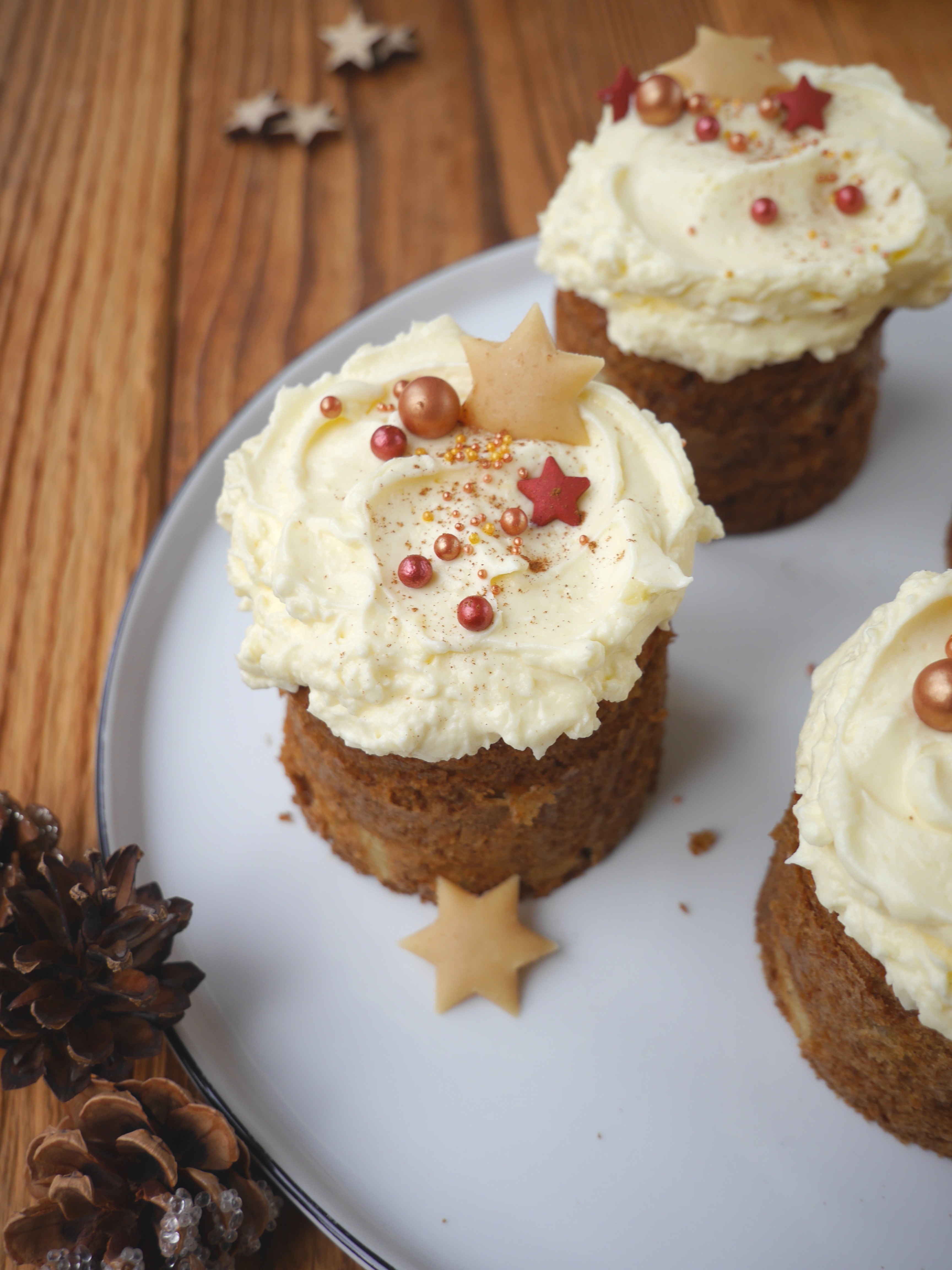 2. Für das Cheesecake-Topping die weiche Butter schaumig schlagen und nach und nach den Frischkäse unterrühren. Sobald eine schöne, glatte Creme entstanden ist, die übrigen Zutaten zur Creme rühren. Die fertige Creme auf den Küchlein verteilen und glattstreichen.