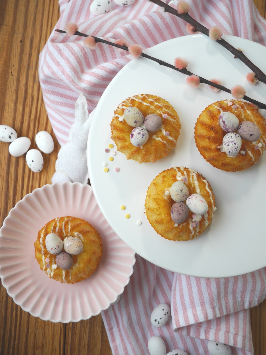 2. Für die Deko die Kuvertüre im Wasserbad oder mit dem Schokoladenschmelzgerät schmelzen und die Guglhupfe damit verzieren. Nach Belieben mit den Ostereiern etc. dekorieren.