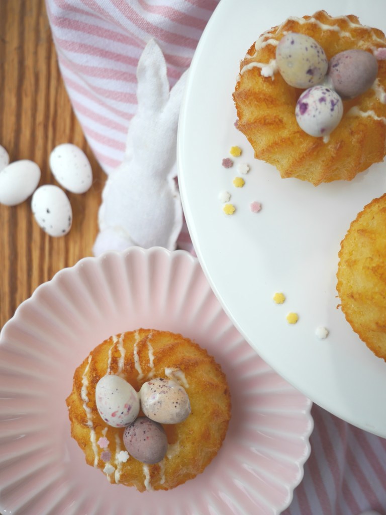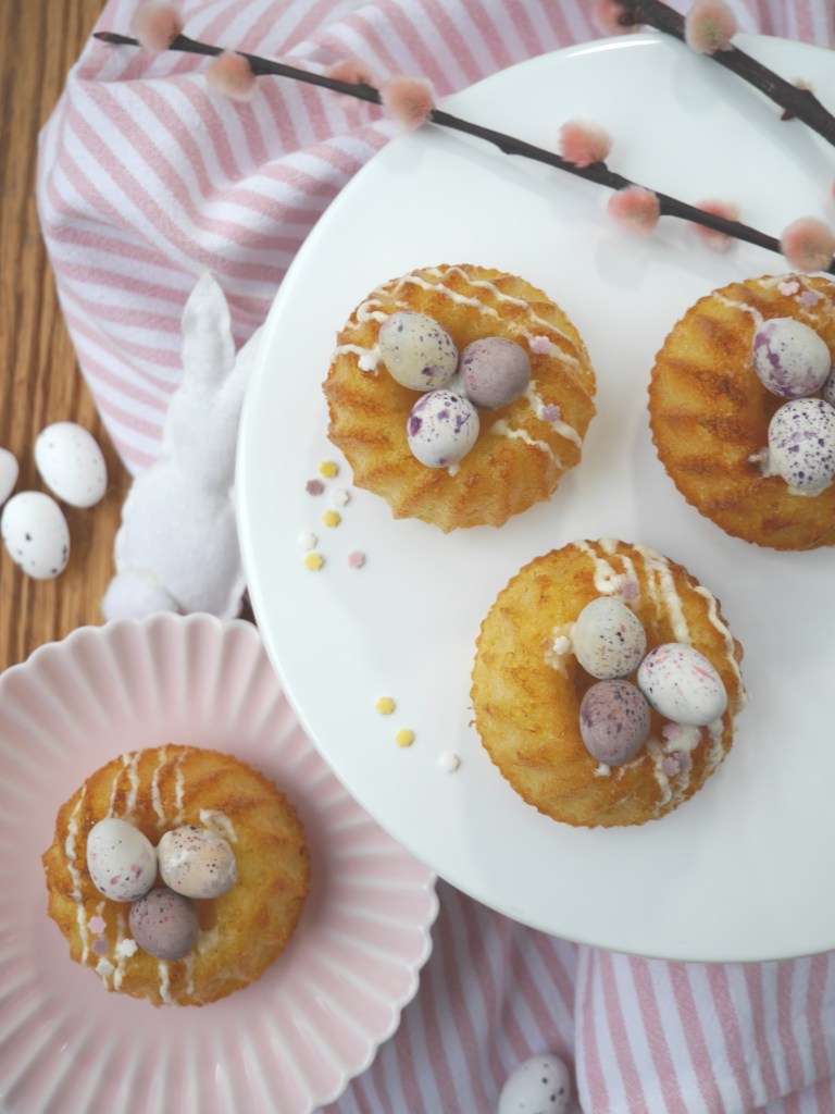 Den fertigen Teig in leicht gefettete Mini-Guglhupfformen füllen und im vorgeheizten Backofen (180 Grad Umluft) 15-20 Minuten blass ausbacken. Abkühlen lassen und stürzen.