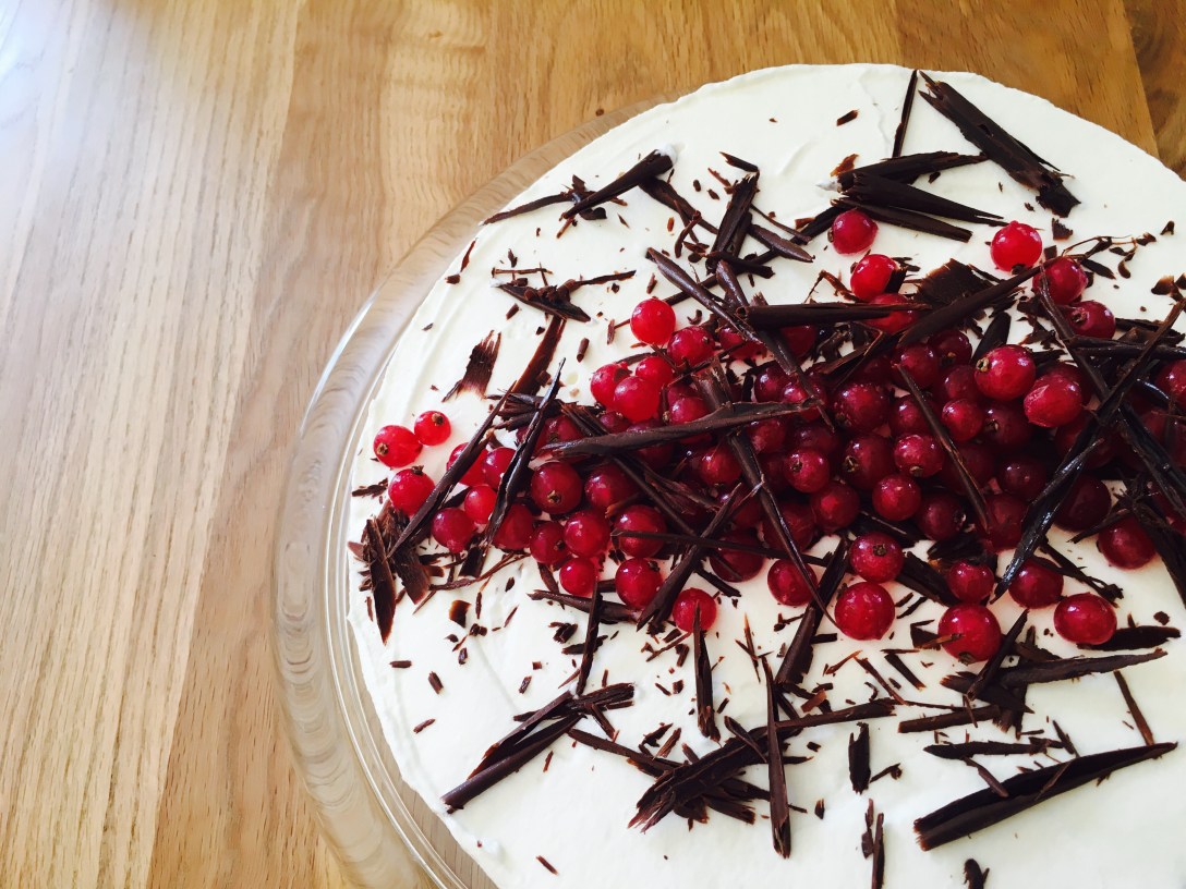 Sahne mit dem Zucker steif schlagen und dekorativ auf der Torte verteilen. Mit den Schokospänen und den Johannisbeeren dekorieren.
