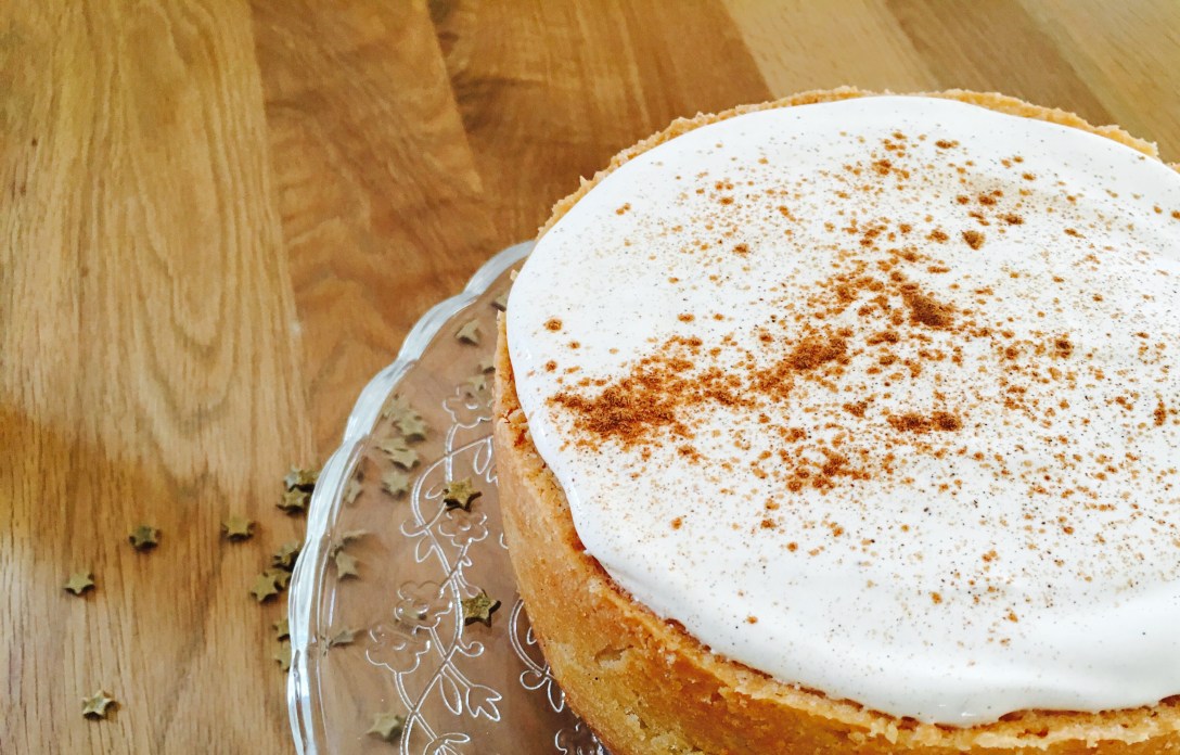 3. Für die Deko den Schmand mit 1 EL Zucker und dem Mark der Vanillestange glatt rühren. Die Sahne steif schlagen und unter den Schmand heben. Die fertige Creme auf dem abgekühlten Kuchen verteilen und mit Zimt dekorieren.