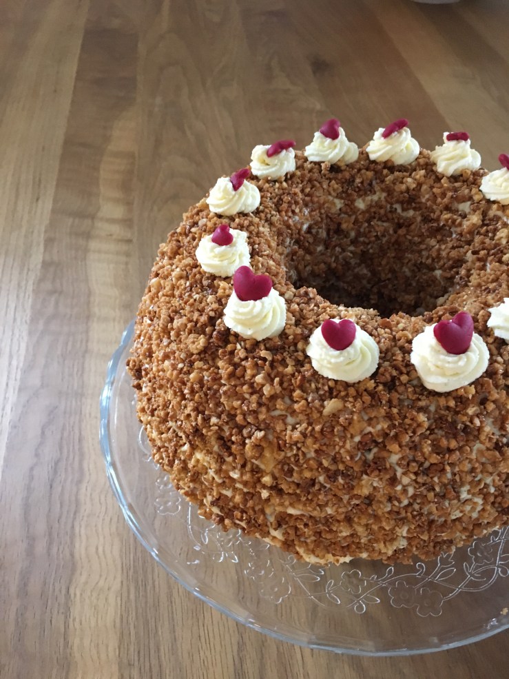 Zum Schluss den Kranz mit dem Krokant rundum bedecken und mit Hilfe des Spritzbeutels 12 Rosetten auf den Kranz spritzen. Nach Belieben mit Fondantherzen oder Belegkirschen etc. verzieren.