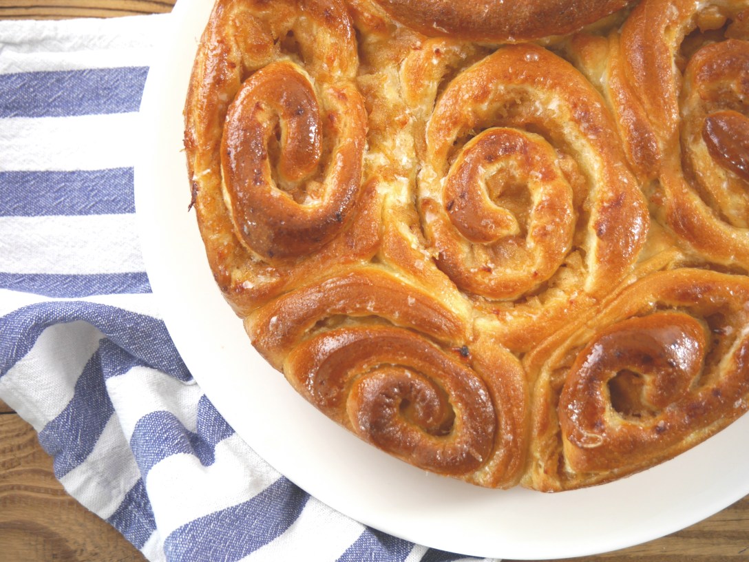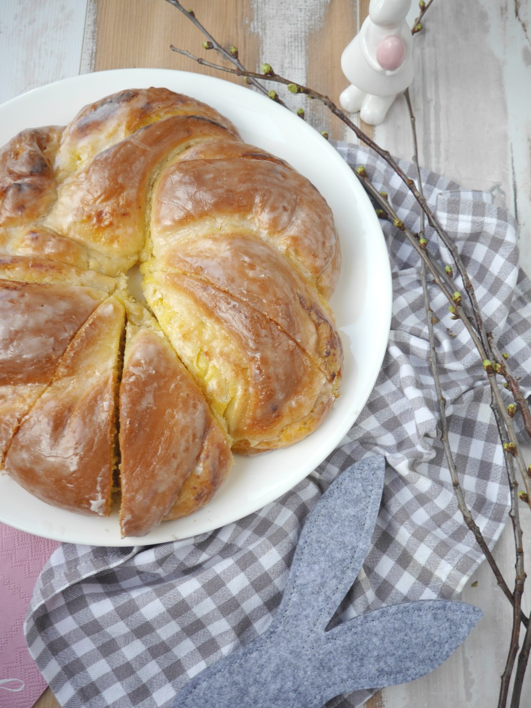Um eine schön goldgelbe Oberfläche zu bekommen, kurz vor dem Backen den Teig mit ein wenig Eigelb oder Milch bestreicht.