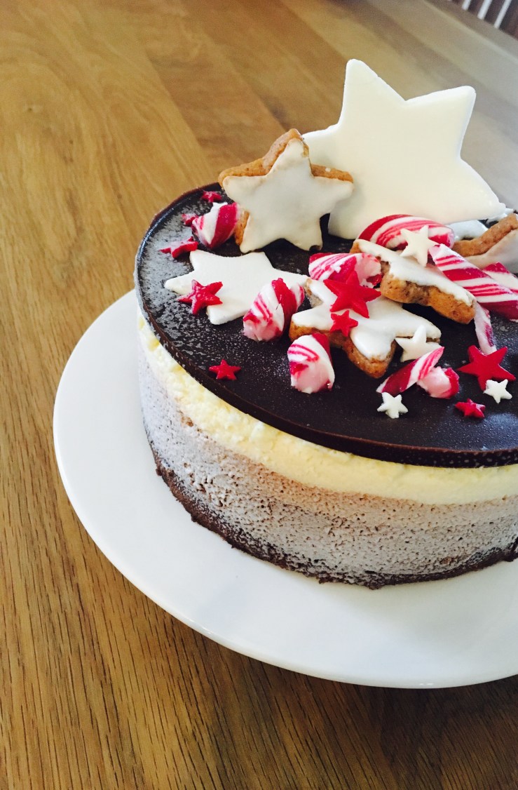 Die noch flüssige Schokoschickt mit der Zuckerstange und Sternen dekorieren und erstarren lassen. Sobald sie fest ist von der Unterlage lösen und auf die Torte setzen.