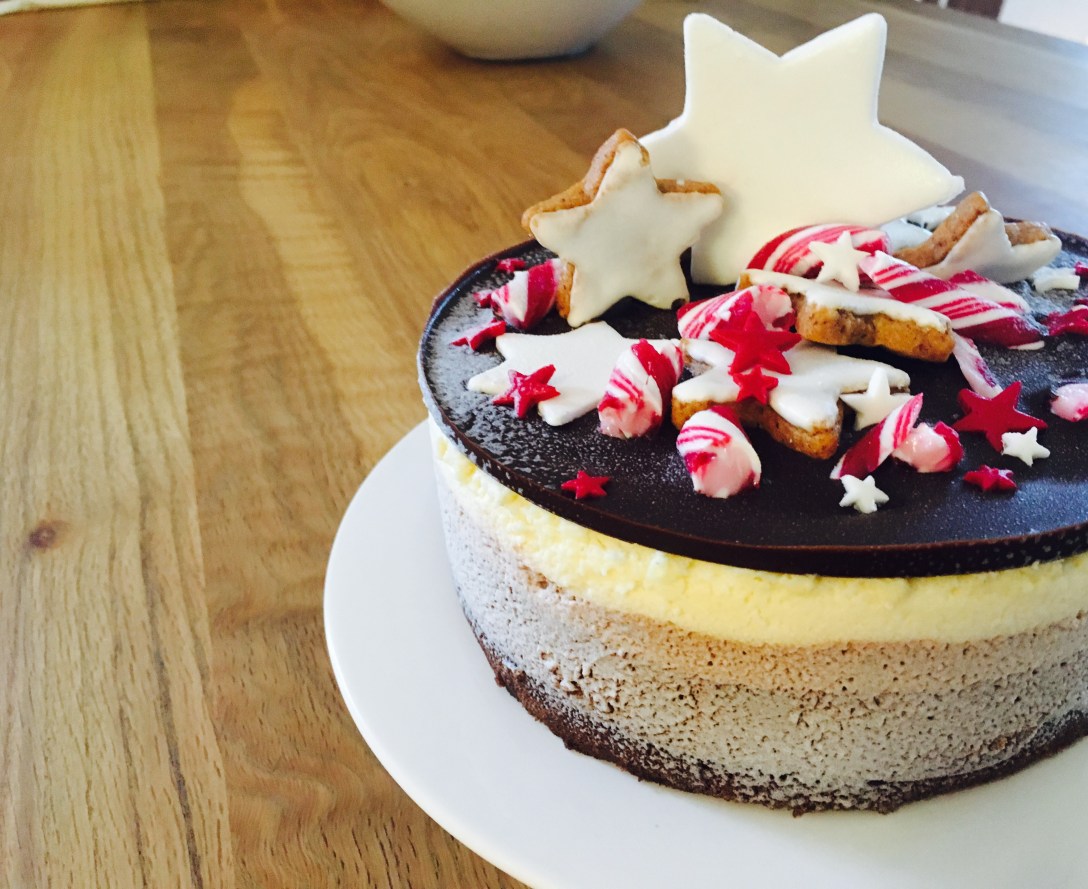 Die noch flüssige Schokoschickt mit der Zuckerstange und Sternen dekorieren und erstarren lassen. Sobald sie fest ist von der Unterlage lösen und auf die Torte setzen.